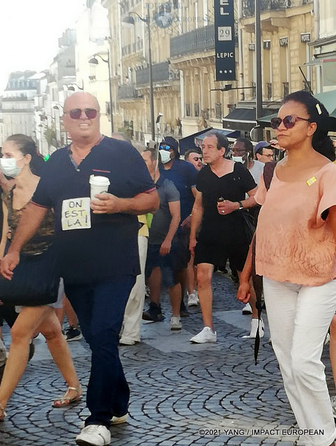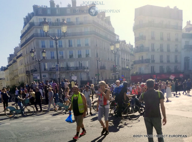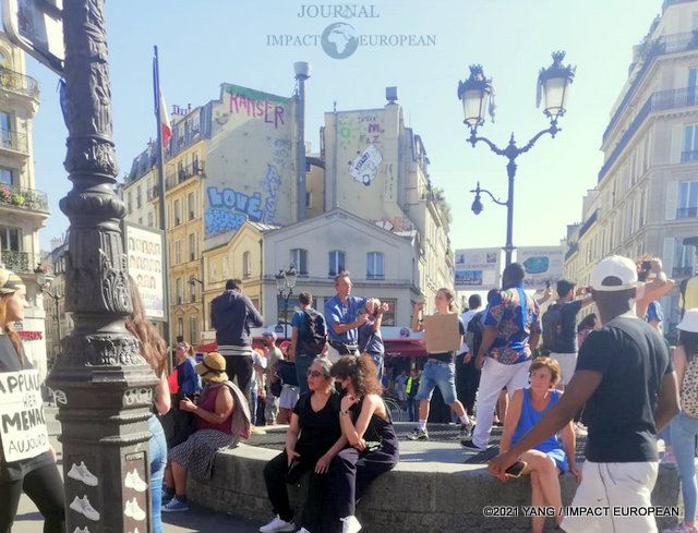 La manifestation est partie de la porte Dorée à 13h. Elle était encadrée de nombreuses forces de l’ordre. Les manifestants étaient toujours aussi nombreux. Ils se sont dirigés vers la Nation, la Bastille et la République pour rejoindre la place Clichy. On constatait des pancartes contre le vaccin et le pass sanitaire mais aussi contre la politique d’Emmanuel Macron. Cela se traduisait par des slogans comme « Vaccination, qu’ils viennent me chercher! » en co-notation avec les déclarations du président face à des députés LREM au début de son quinquennat. On pouvait aussi entendre des slogans comme « Le pass, on en veut pas! », « Non au pass sanitaire! » et chanter « On est là!… » . Il y a eu quelques échauffourées lors de la dispersion à l’arrivée du cortège, place Clichy.