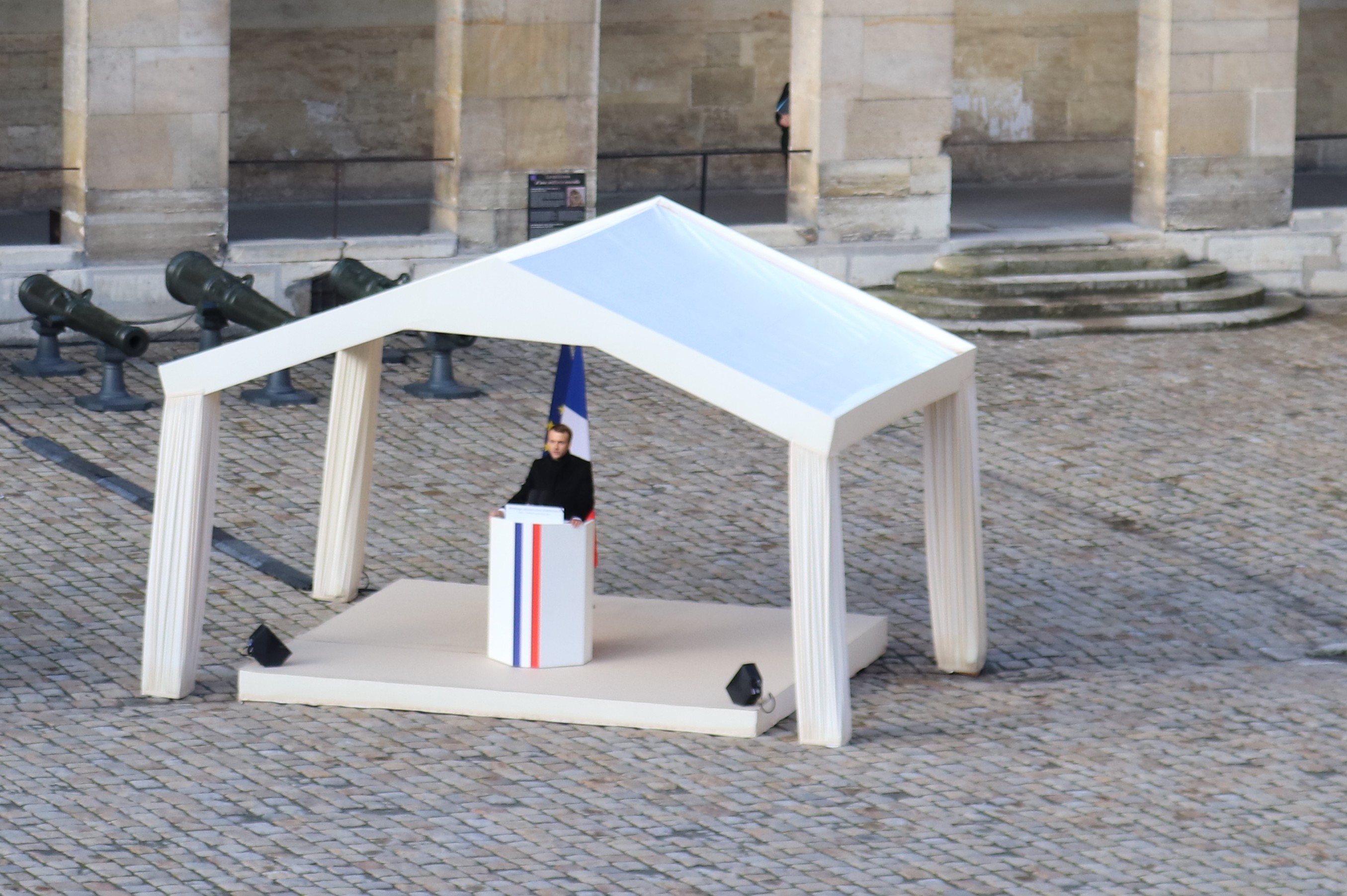 «La France est ce pays complexe où la gaieté, la quête du bonheur, l’allégresse, qui furent un temps les atours de notre génie national, furent un jour, on ne sait quand, comme frappés d’indignité», a dit Emmanuel Macron.
