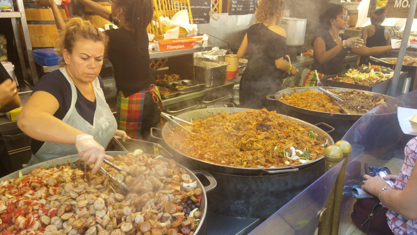 Toutes sortes de produits de nos régions – truffades, rougails saucisses, volaille gingembre – mijotent dans de gigantesques pôeles qui réchauffent encore plus l’atmosphère.