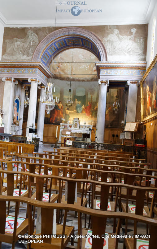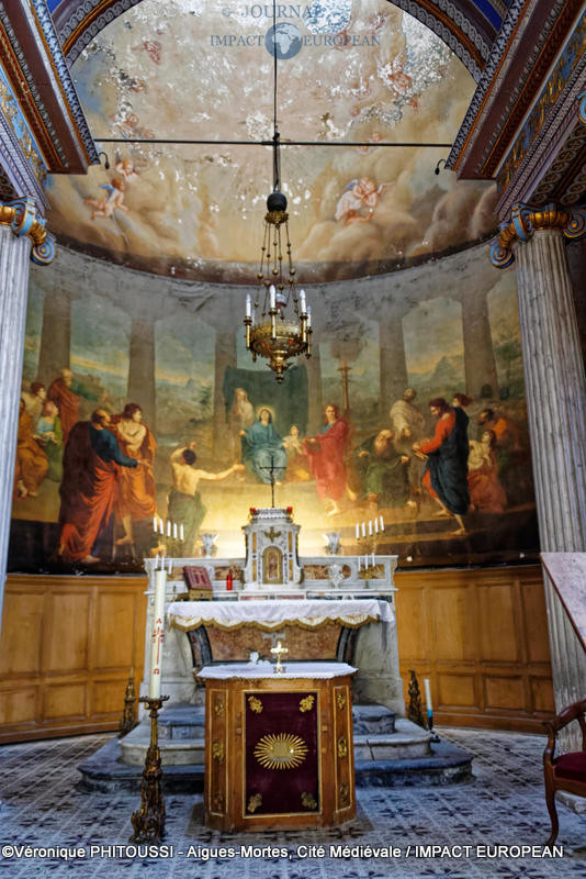 Au-dessus du chœur, sur la voûte, on peut voir une copie du retable de Jérusalem où le Christ a célébré la Pâque et le jeudi Saint avec ses apôtres. Autour du maître-autel, une peinture sur toile retrace la descente du Saint Esprit le jour de la Pentecôte. On l’attribue à Xavier Sigalon, peintre né à Uzès en 1778. De chaque côté du chœur se dressent deux statues : à gauche saint Félix pour la rédemption des captifs, à droite saint Jacques le Mineur, premier évêque de Jérusalem.