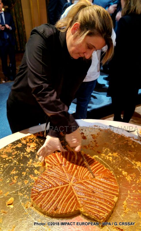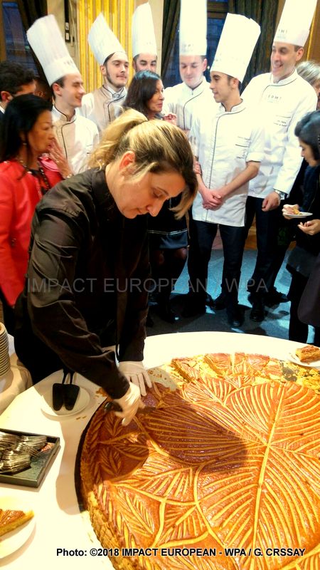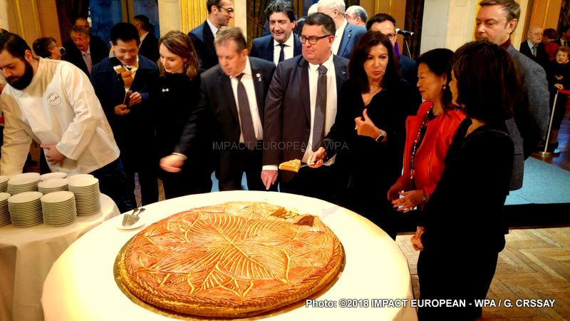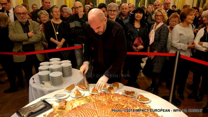 Deux galettes des rois géantes, fabriquées cette année par Sébastien Bretteau, artisan installé dans le 7e arrondissement, chacune découpée en une centaine de parts, ont régalé les invités qui ont apprécié la finesse de la pâte feuilletée ainsi que la qualité de la frangipane.