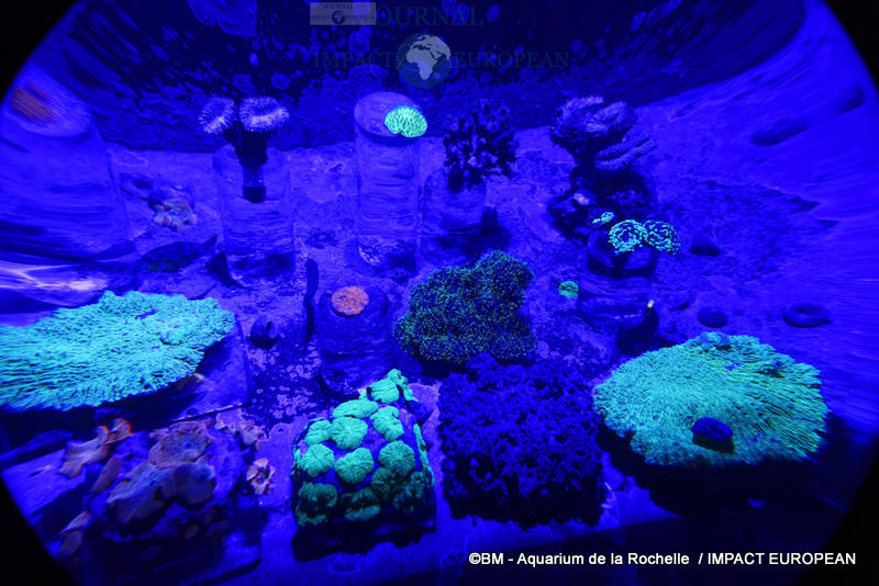 Diverses espèces de poissons, invertébrés et coraux cohabitant des grandes barrières de corail, des archipels hawaïens et de la mer Rouge. On peut admirer la vie du récif nocturne dans 3 aquariums plongés dans l’obscurité : bioluminescence, fluorescence et absorption de la lumière. Un dernier aquarium montre des boutures de coraux.