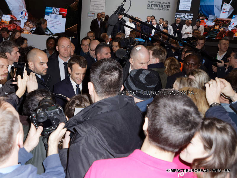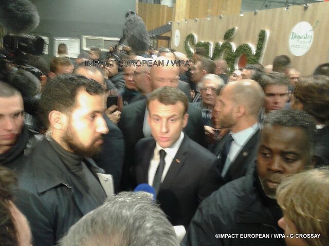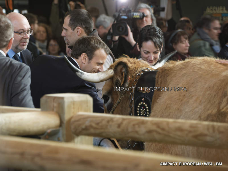 Plus tôt, le président avait été accueilli par des agriculteurs déguisés, des bousculades et des applaudissements pour sa première visite en tant que président de la République.