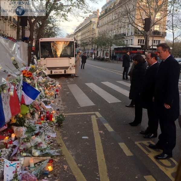 Peu auparavant, le premier ministre britannique et le chef de l’Etat français s’étaient recueillis ensemble devant le Bataclan. Selon la présidence française, les deux hommes ont déposé chacun une rose devant la salle, où au moins 89 personnes ont été tuées, dont un Britannique. «Le président Hollande et moi côte à côte au Bataclan», a twitté David Cameron, en publiant une photo.