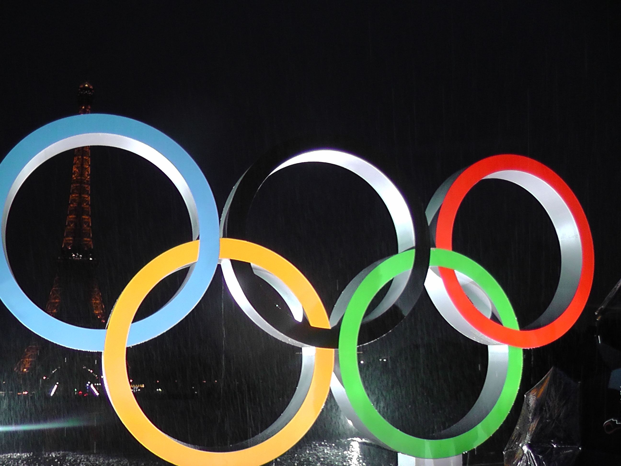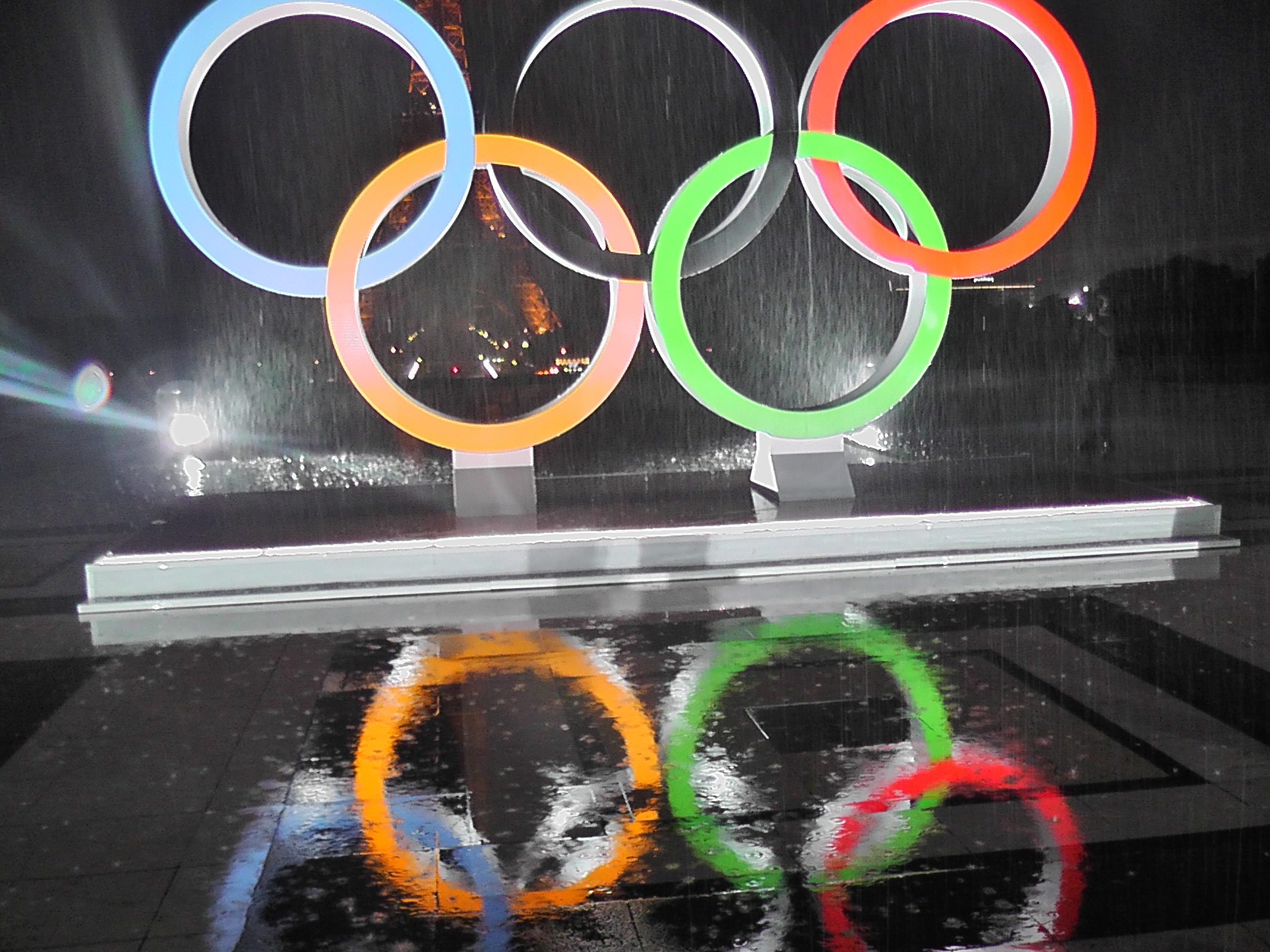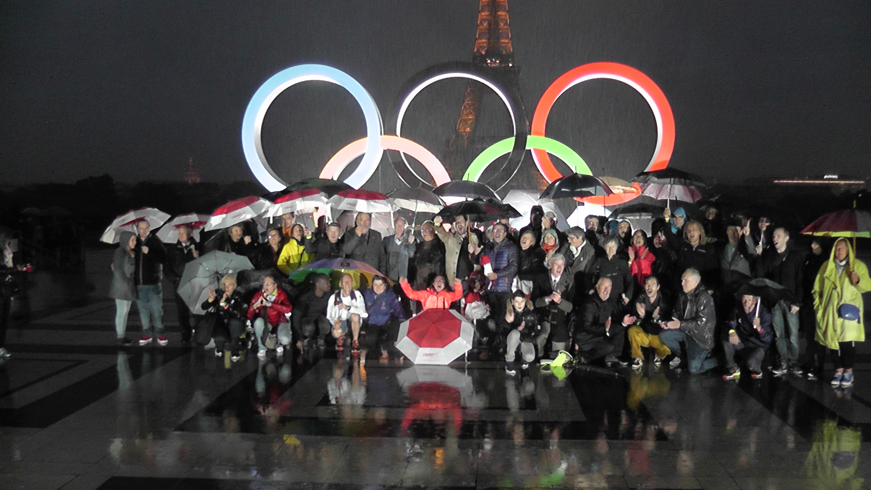 Au même moment, à Paris, le premier adjoint de la maire de Paris, Bruno Juillard dévoilait les anneaux olympiques sur le parvis du Trocadéro sous une pluie battante.