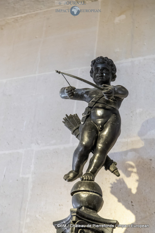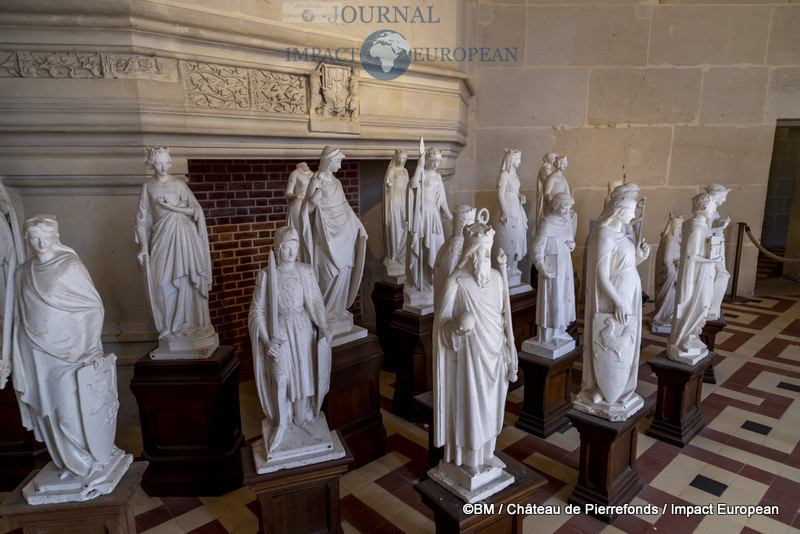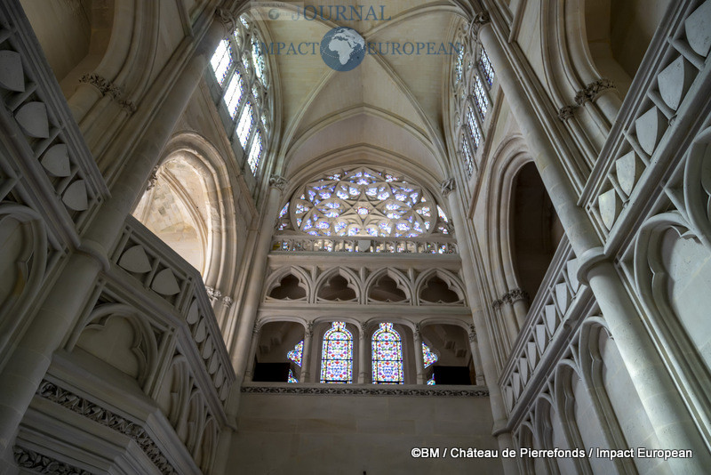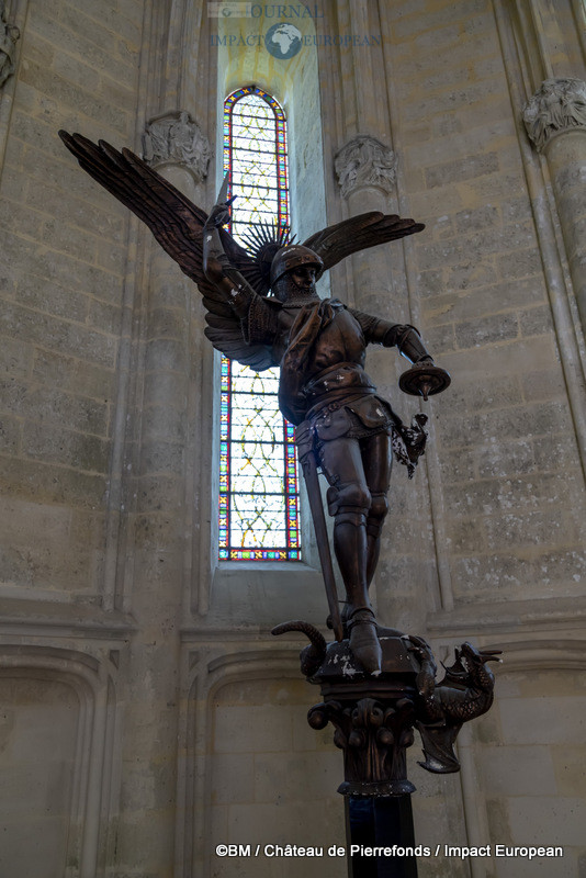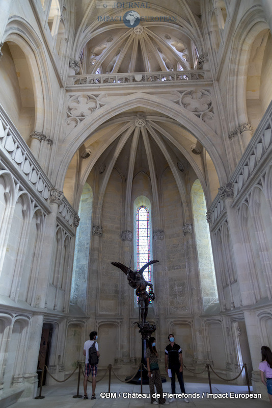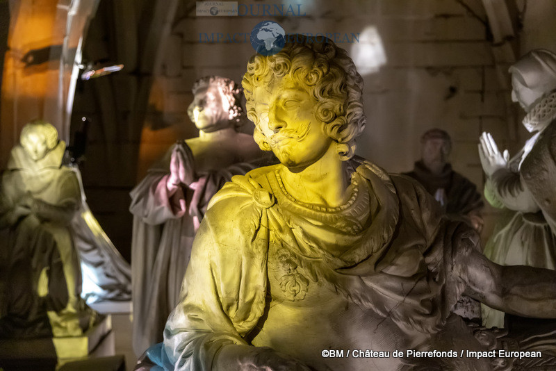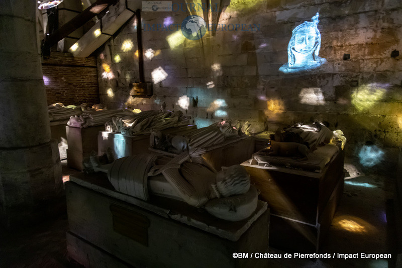 Dans la crypte, se tient « Le bal des Gisants« , une exposition permanente, son et lumières où éclairages en mouvement, poèmes chuchotés, murmures, ambiances sonores et audiovisuels donnent vie à une centaine de gisants (Un gisant est une sculpture funéraire de l’art chrétien représentant un personnage couché à plat-dos, vivant ou mort dans une attitude béate ou souriante, l’effigie étant habituellement placée sur le dessus d’un cénotaphe ou, plus rarement, d’un sarcophage)et orants (un orant ou priant est dans l’art religieux, un personnage représenté dans une attitude de prière, souvent agenouillé, les bras levés ou écartés, parfois devant un prie-Dieu ). Ces moulages de plâtre sculptés de lumières ont été commandés par Louis-Philippe pour le musée national du château de Versailles, provenant pour la plupart de la nécropole de la Basilique Cathédrale de Saint-Denis et réalisés par les plus grands artistes de leur temps. Parmi ces gisants, figurent certains personnages qui ont marqué l’histoire de Pierrefonds, comme Louis et Charles d’Orléans ou Valentine Visconti d’Orléans.
