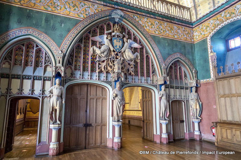 Même si le style gothique prédomine dans l’architecture, celui d’autres époques se retrouve mêlé aux inspirations du constructeur comme dans la cour intérieure avec ses galeries Renaissance. Pour la décoration intérieure, on assiste à un travail d’invention et de création beaucoup plus que de restauration. Il invente un style « néo-médiéval » autour des volumes avec des sculptures, des meubles, des boiseries, un décor peint polychrome dans la salle des Preuses de 50 mètres de long, il concilie les vestiges médiévaux et la vie de la cour au temps de Napoléon III, le « style troubadour » très en vogue durant le Second Empire et « l‘Art Nouveau« que l’on retrouvera dans les années 1900. Le château de Pierrefonds est un exemple du savoir-faire français.