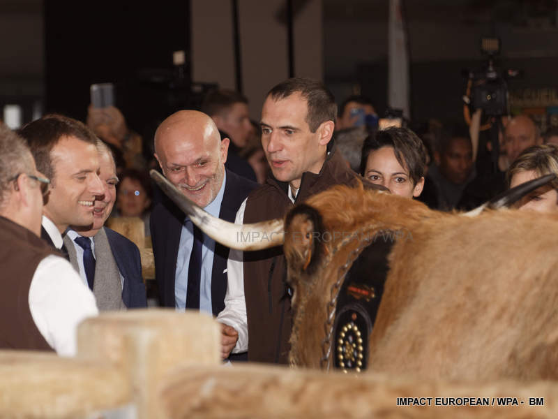 Emmanuel Macron était accompagné entre autres de son ministre de l’Agriculture, Stéphane Travert ( qui a ajouté » de porc »?).