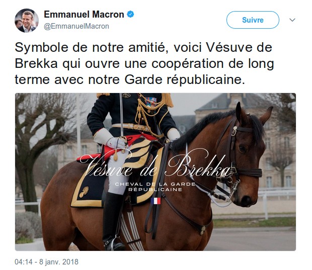 Vésuve de Brekka, est né le 10 juin 2009 à Colomby, dans l’élevage de M. et Mme Le Boulanger. Ce hongre bai brun appartenait à la Garde républicaine depuis 2012. Il a réalisé sa dernière escorte présidentielle le 11 novembre 2017 sur les Champs-Elysées.