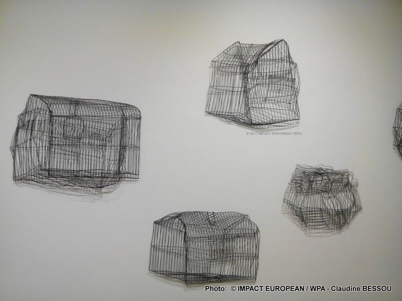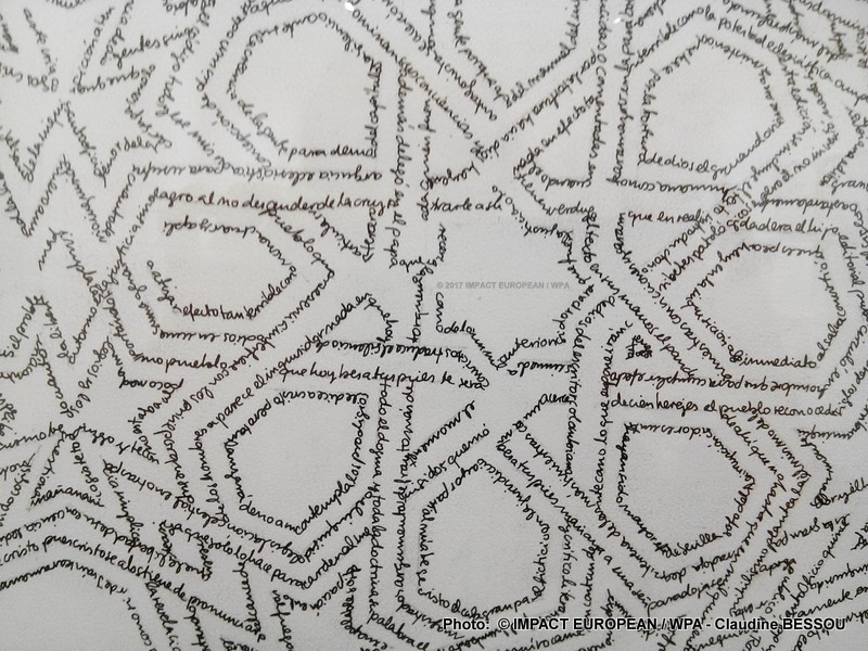 Johanna Calle est une artiste Colombienne qui crée des dessins poétiques en utilisant un art graphique qui lui est personnel. Elle manipule aussi bien le fil de fer que le fil à coudre, les textes et les lettres dactylographiées, pour composer un tableau imagé.