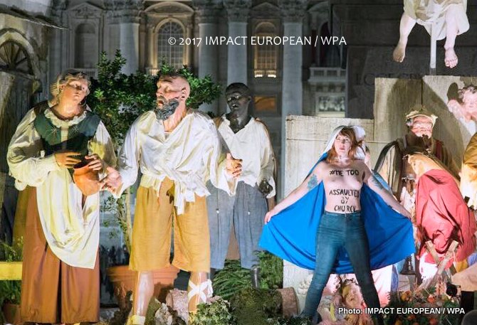 Deux premières activistes se sont introduites dimanche lors de la messe de minuit et la troisième s’est rendue dans la crèche ce lundi. Toutes trois avaient peint sur leur torse, en grosses lettres noires, le hashtag #MeToo (« Moi aussi »), utilisé par les victimes de harcèlement ou d’agressions sexuels, suivi du slogan « Assaulted by church » (« Agressée par l’Eglise). Sur leur dos, elles avaient écrit « God is woman » (« Dieu est femme »).