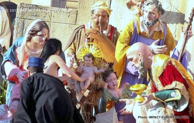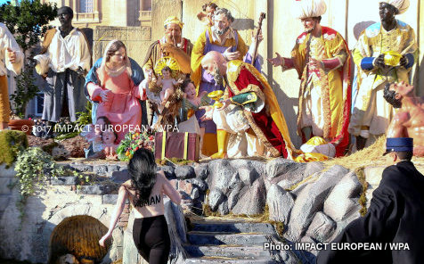 Lors de la messe de minuit ce 24 décembre, deux militantes Femen ont fait irruption dans la crèche installée devant la basilique Saint-Pierre. Une troisième militante a renouvelé l’action ce lundi 25 décembre, avant d’être rapidement interpellée.