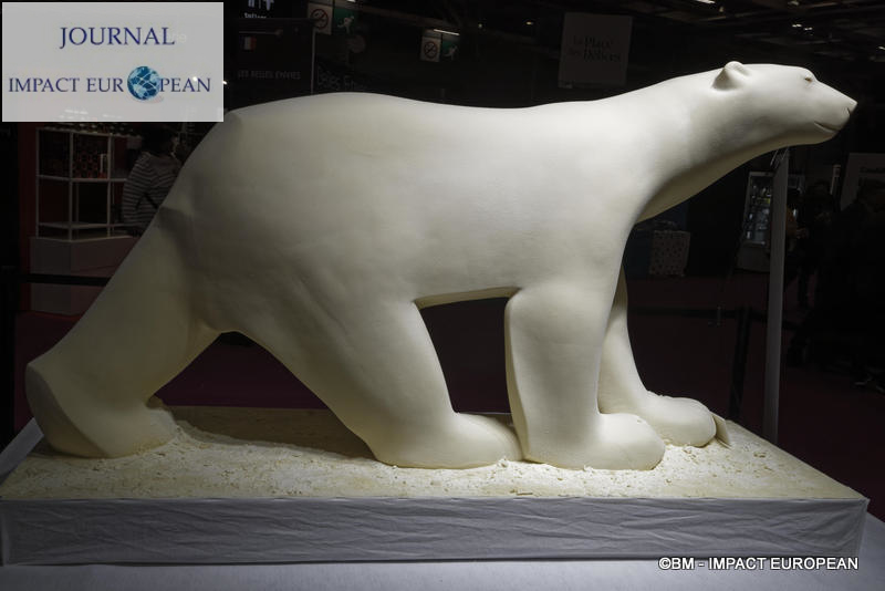 Le chef pâtissier voyageur et MOF, Nicolas Bernardé , a réalisé l’Ours Blanc en chocolat pour célébrer le 25ème anniversaire. Monumentale réalisation conçue avec près de 200 kg de chocolat blanc , il mesure 2m50 de long, 1m35 de haut et 80 cm de large. L’Atelier Promothée, mouleur d’art et fournisseur des Musées Nationaux et du Château de Versailles a permis la mise en oeuvre de cette sculpture inspirée de l’artiste Pompon .