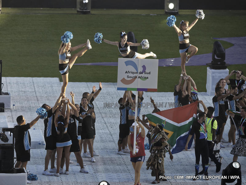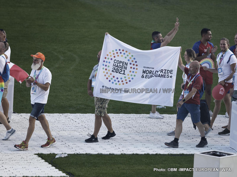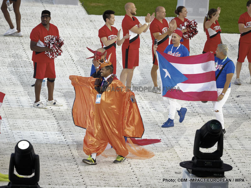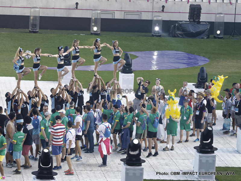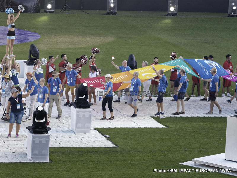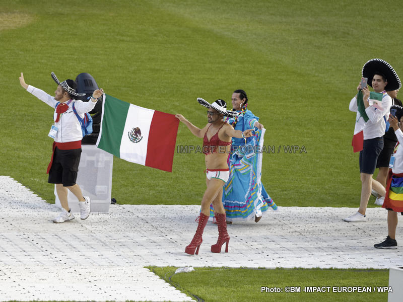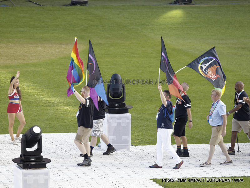 La soirée a été suivie d’un défilé des sportifs, dont certains étaient déguisés et maquillés ou agitaient des ballons et rubans arc-en-ciel.