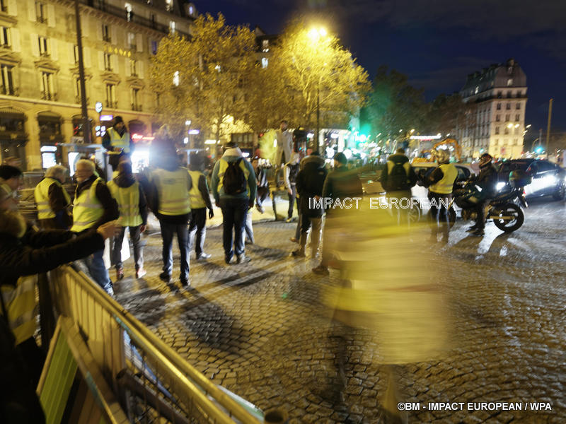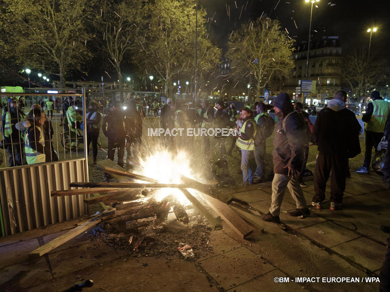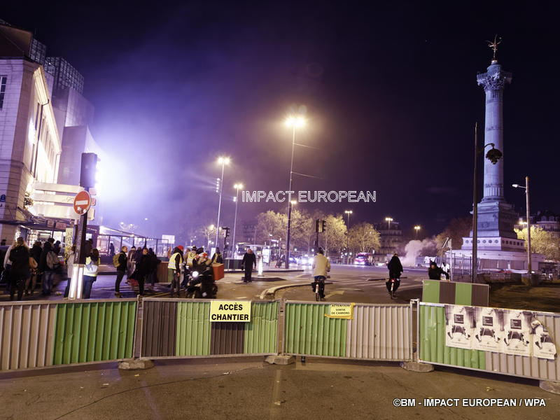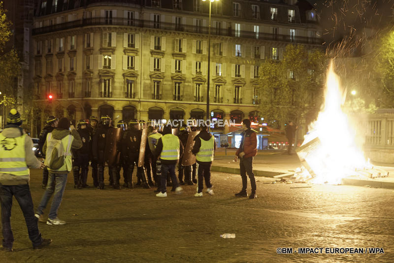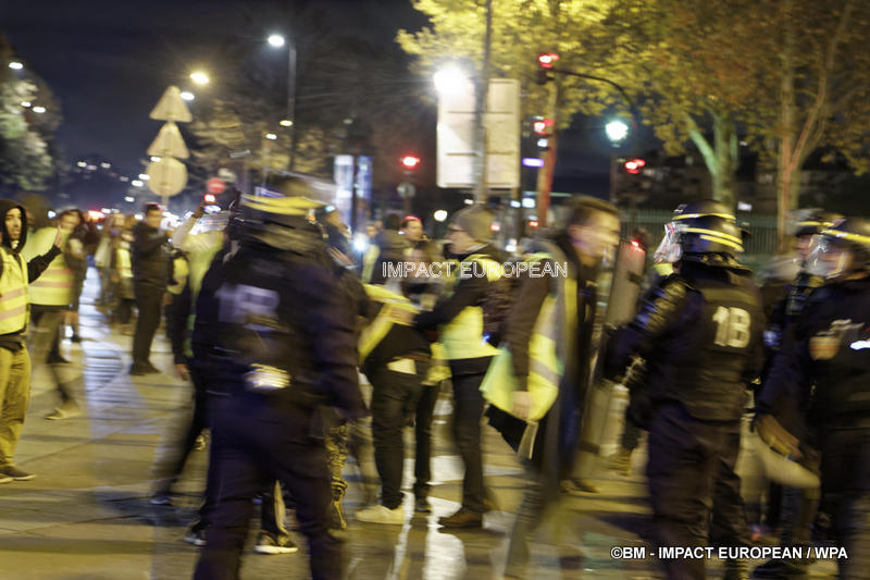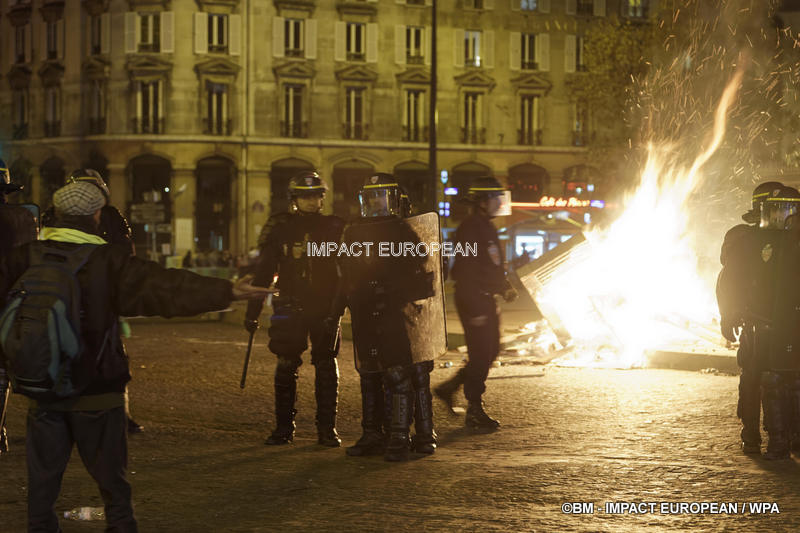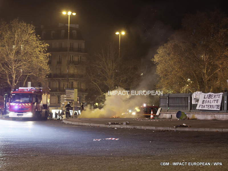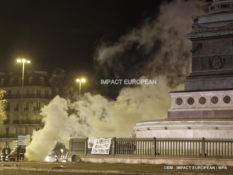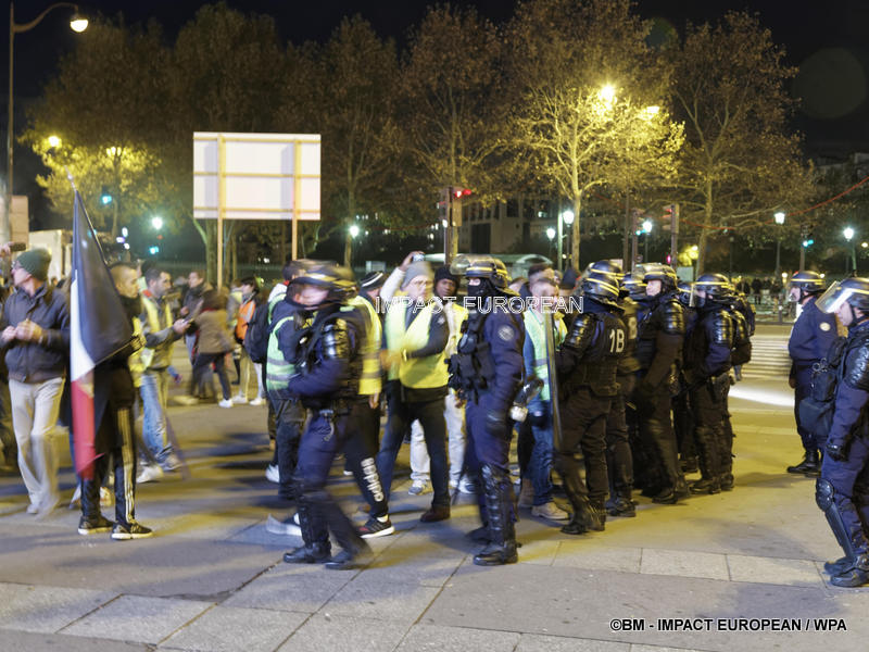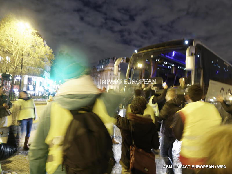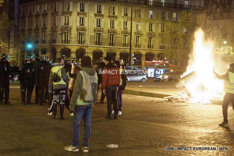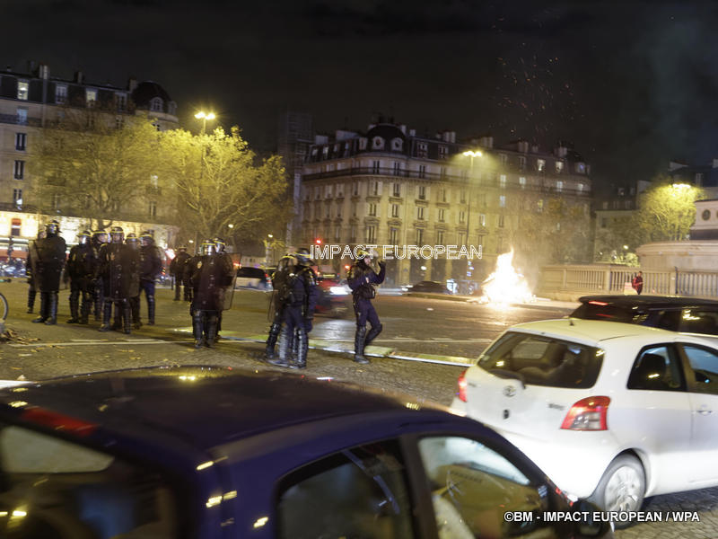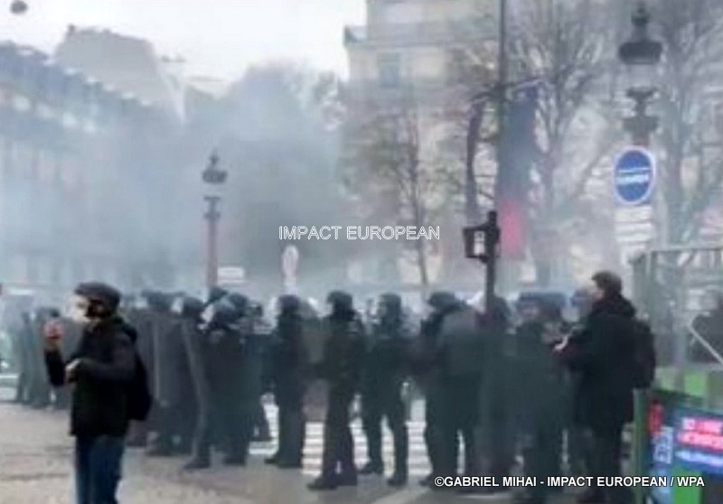 Tirs de grenades lacrymogènes et jets des canons à eau ont répondu aux tirs de mortiers d’artifice et jets de projectiles de toutes sortes : bouteilles, pavés, planches… La place est envahie par les fumées irritantes. Les manifestants fuient dans les rues adjacentes ou reculent vers l’Arc de Triomphe.