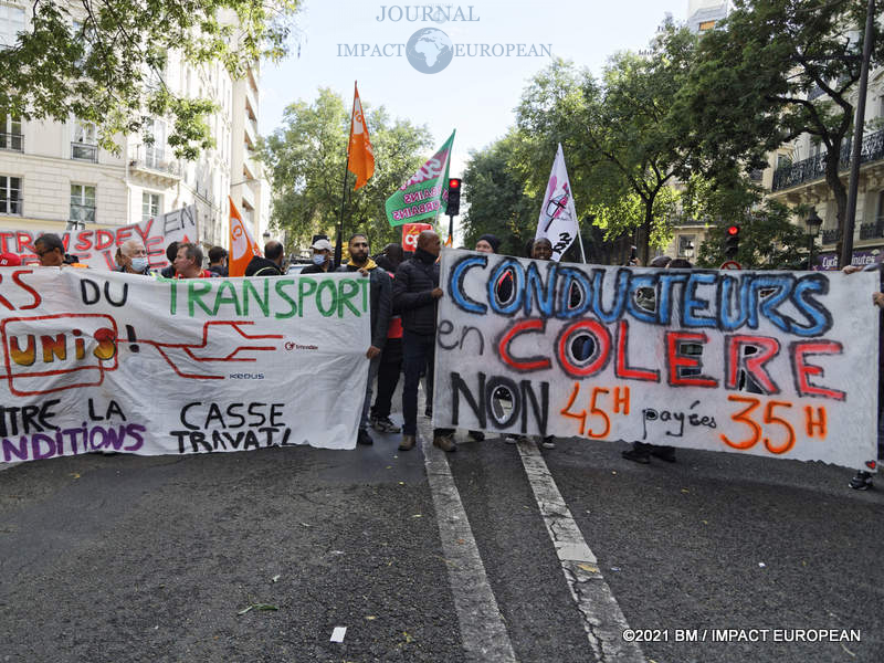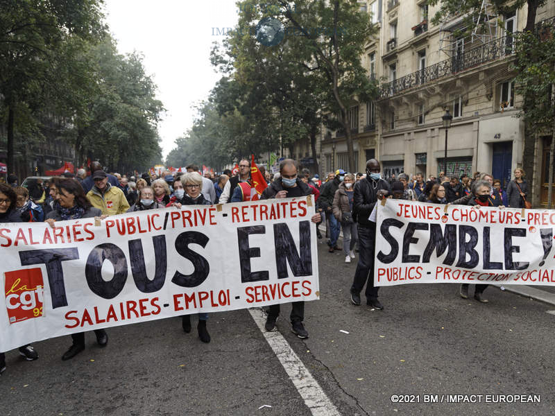 Sur la banderole de tête, on pouvait lire: » Retraites, salaires, services publics, assurance-chômage, non à la régression sociale, non au passe sanitaire comme outil de répression ». On pouvait entendre des slogans comme: « Jeunes actifs, chômeurs et retraités, c’est tous ensemble qu’il faut lutter. Jeunes actifs, chômeurs et retraités, c’est tous ensemble qu’on va gagner.