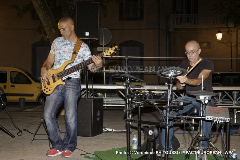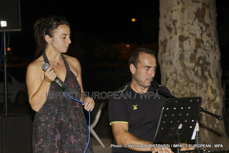 Philippe Costes à la guitare et Gérard Cuoq à la batterie du groupe Heaven Trio en concert, Place de la Marine à Agde le 25 juillet 2018, FranceDorine Portmann au chant et Eric Payan au clavier du groupe Heaven Trio en concert, Place de la Marine à Agde le 25 juillet 2018, France