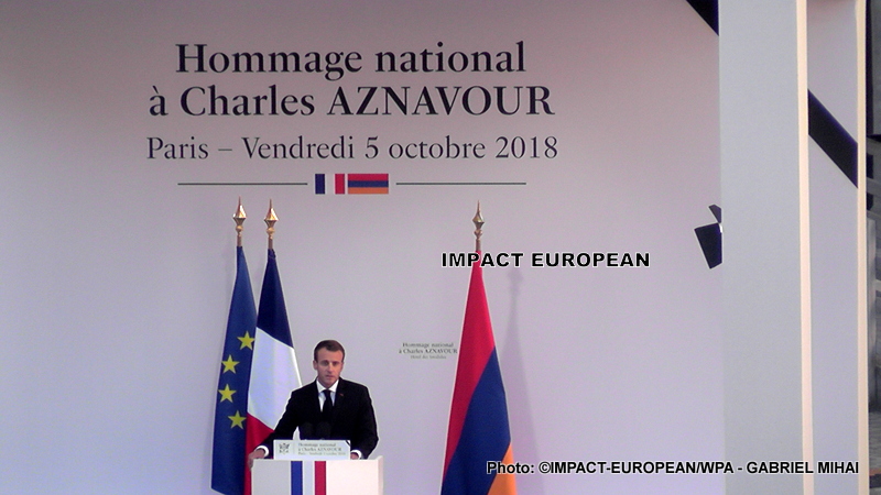 Emmanuel Macron a ensuite pris la parole : « Charles Aznavour aurait voulu vivre un siècle, il se l’était promis, il nous l’avait promis comme un ultime défi lancé à la vie, l’âge ne l’avait pas empêché de rire, de créer, de vivre, mais à quelques encâblures, la mort est venue le chercher et nous avons été surpris et tristes car nous n’avions pas l’habitude que sa volonté ne s’applique pas ».