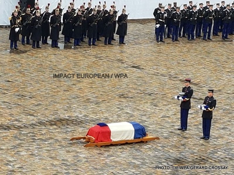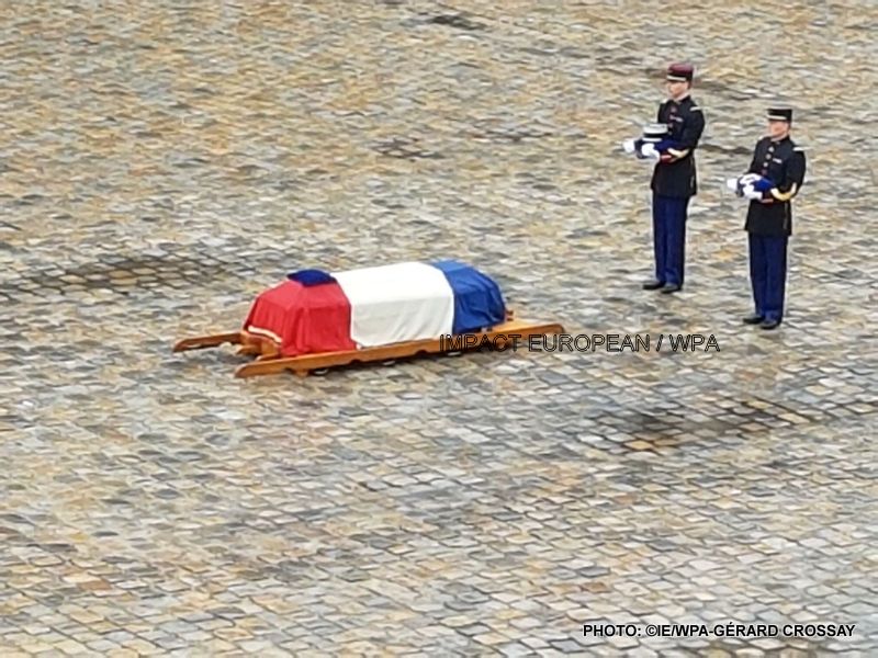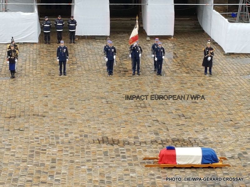Plusieurs centaines de personnes étaient présentes dans la cour de l’hôtel des Invalides où le président Emmanuel Macron a prononcé l’éloge funèbre de l’officier de 45 ans, promu au rang de colonel à titre posthume. Il a également été cité à l’ordre de la Nation pour son «courage exemplaire» et sa «totale abnégation», et a reçu le grade de commandeur de la Légion d’honneur. Cette cérémonie était ouverte au public et environ 2 000 personnes ont rendu hommage à Arnaud Beltrame devant les Invalides.