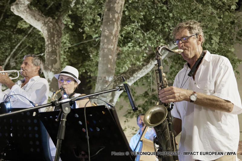 Bruno, piano (L), Rosalie (trombone), Joseph (alto sax), Etienne (double bass), Francis (trumpet and driver),Sylvie (alto sax & soprano), Jean-Luc (tenor sax), Etienne (double bass), Jean-Mathieu (drums) from The jazz group, Jazzinade, performed in concert, Place de la Marine, in Agde, France, July 4, 2018