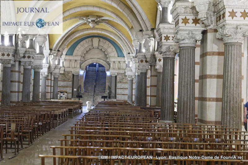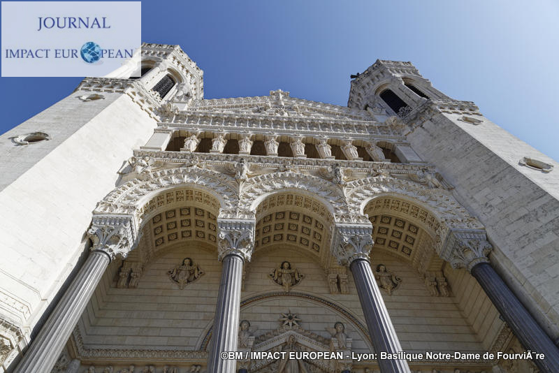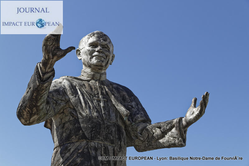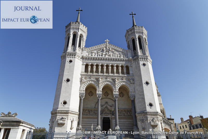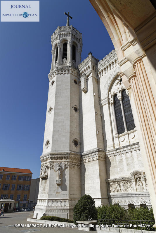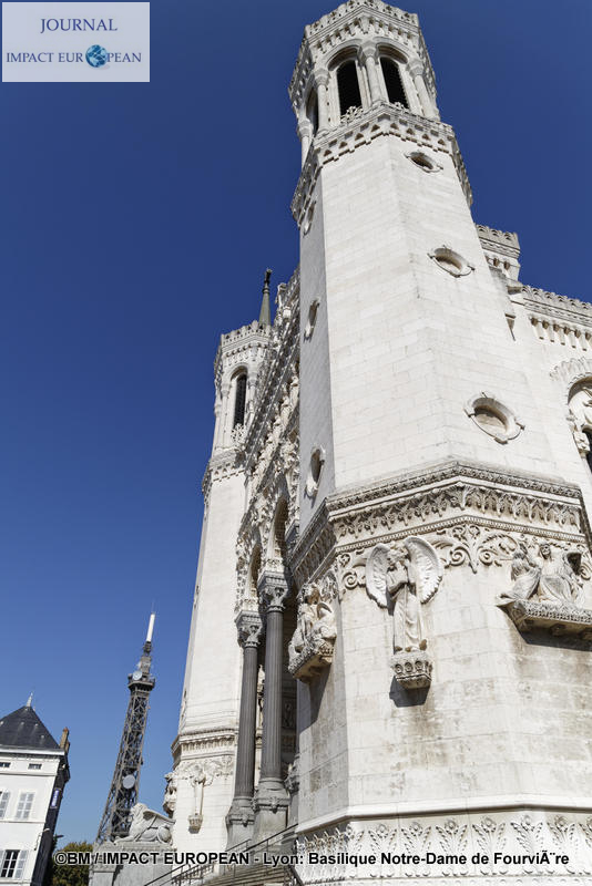 Bien qu’inaugurée en décembre 1896 (la date du 8 septembre reportée à celle de la « Fête de l’Immaculée Conception » le 8 décembre suite à des intempéries donna naissance à la « Fête des Lumières »), les travaux ne s’achèveront qu’après la seconde guerre mondiale. Une statue de Jean-Paul II (3,05 m de haut) en bronze d’ Elisabeth Cibot, bénissant la ville lors de sa venue à Lyon en Octobre 1986, fut érigée le 4 octobre 2011 sur le parvis de la basilique. La basilique mesure 86 m de long sur 35 m de large; sa hauteur en haut des tours atteint 48 m, son orgue a été construit en 1896 par Michel Merklin et restauré un siècle plus tard. A quelques mètres de la basilique, on remarque la présence d’une petite Tour-Eiffel construite par les anti-calotins qui se sont cotisés afin de montrer leur opposition.