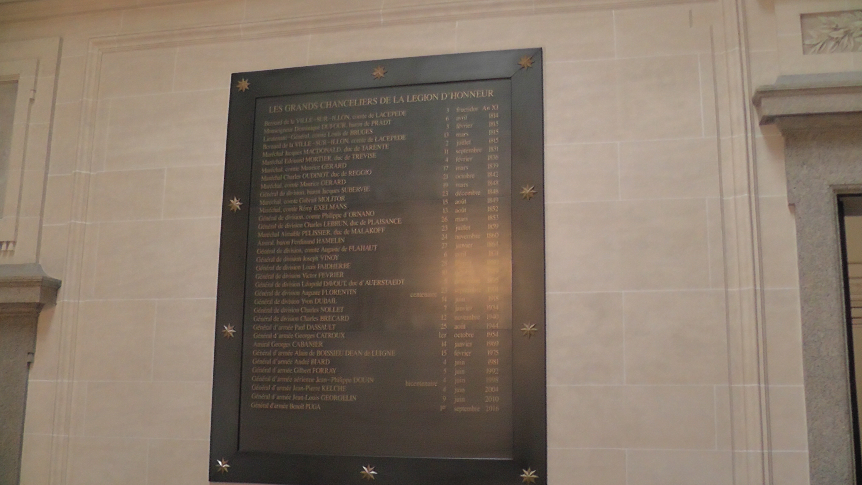 Le siège de la grande chancellerie de la Légion d’honneur est situé dans l’Hôtel de Salm, bâtiment historique au cœur de Paris, il s’agit d’un des rares palais nationaux à n’avoir jamais changé de titulaire et de vocation en plus de deux siècles, à travers deux empires, deux monarchies et quatre républiques, et malgré les dommages subis lors de la Commune et d’un incendie en 1871, le palais est restauré grâce au général Vinoy, 18 éme grand chancelier qui avait chois l’architecte Anastase Mortier.