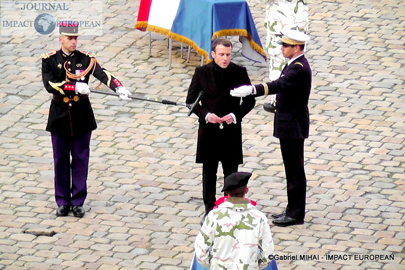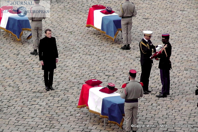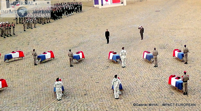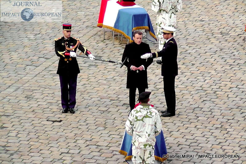 Le président Emmanuel Macron s’est incliné lundi devant « le sacrifice » des soldats, tués au Mali la semaine dernière, « morts pour la France » et « les peuples du Sahel », lors d’un hommage national solennel dans la cour des Invalides, avant de leur remettre la Légion d’honneur à titre posthume.