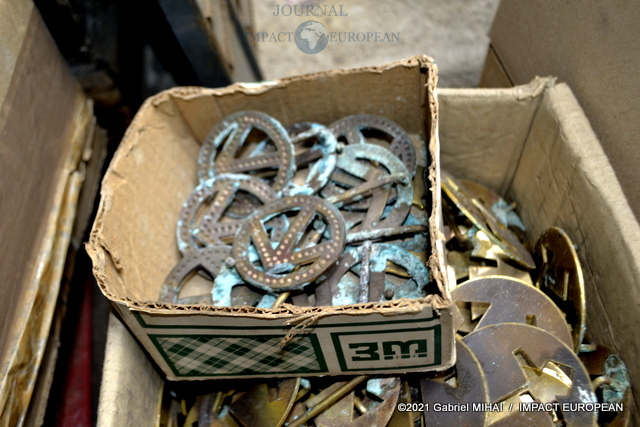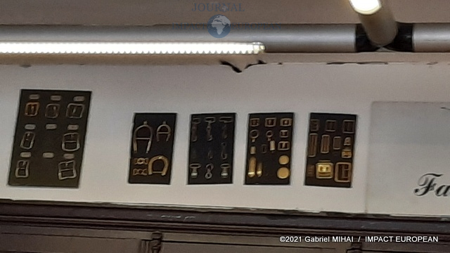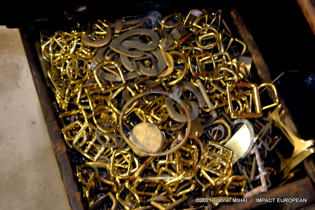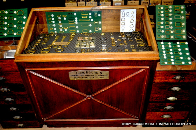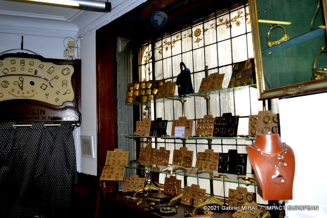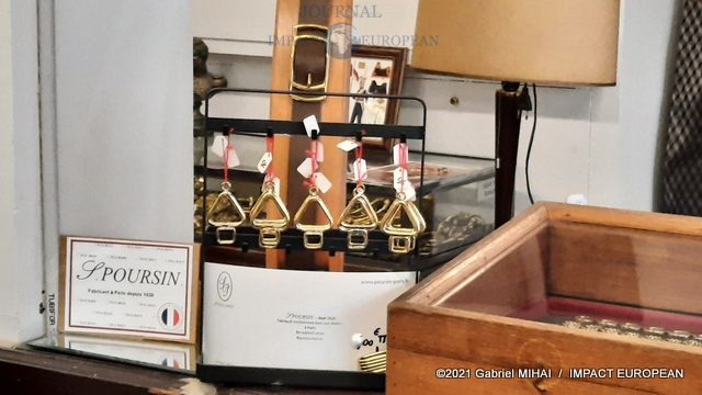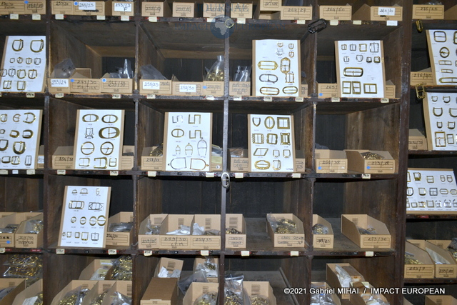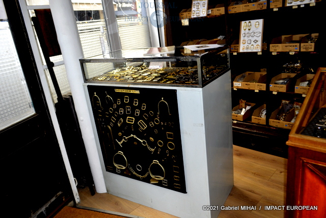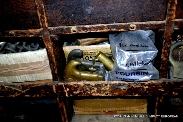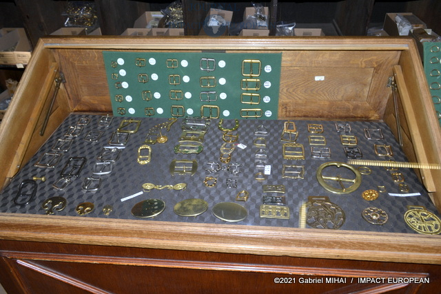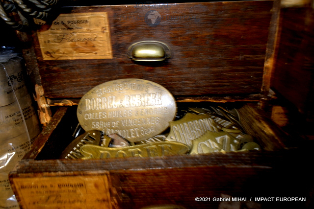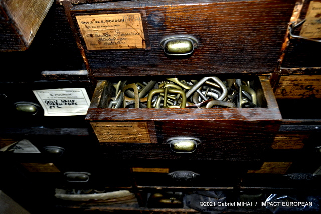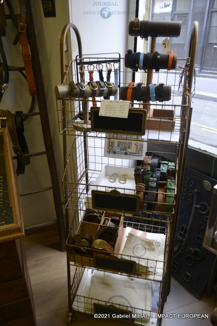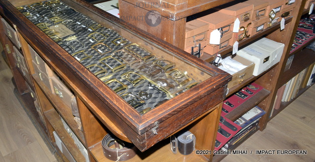 Derrière sa façade bleue, le magasin cache des trésors avec ses armoires de fer, ses casiers et ses tiroirs emplis de milliers de boucles, mousquetons, rivets et autres pièces en laiton pour la maroquinerie et le harnachement de tradition. On trouve même un petit musée de pièces anciennes conçues pour l’attelage et l’univers équestre, regroupée dans une vitrine.