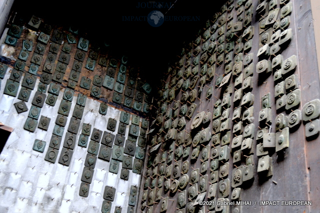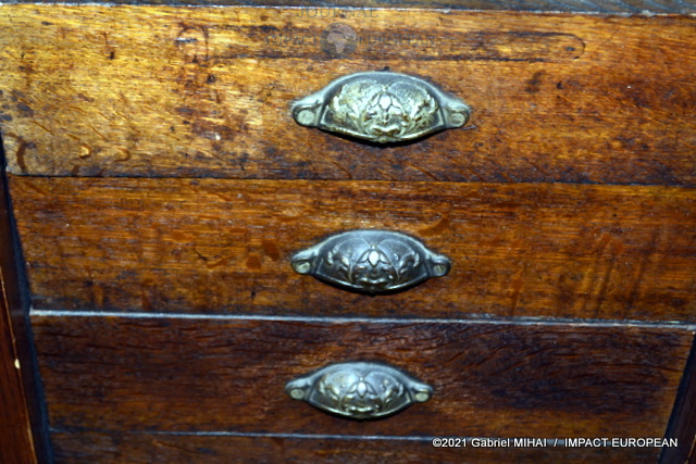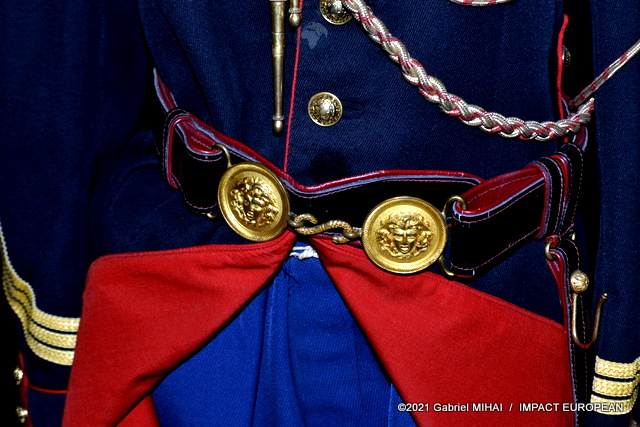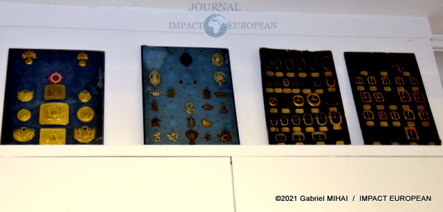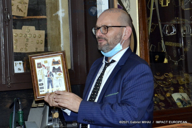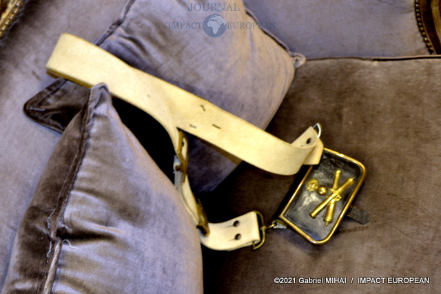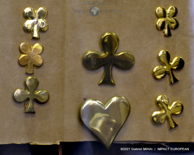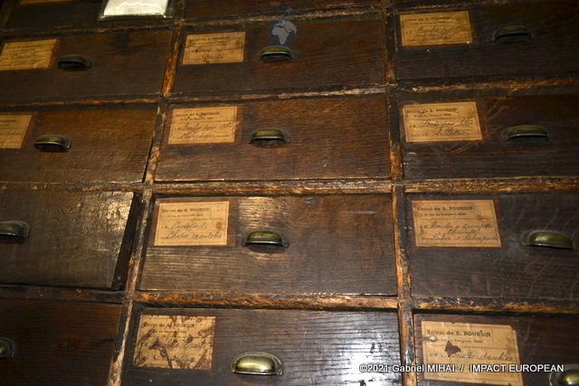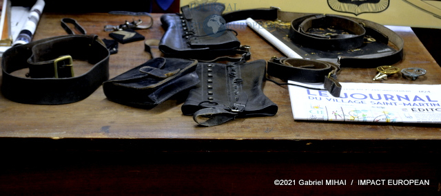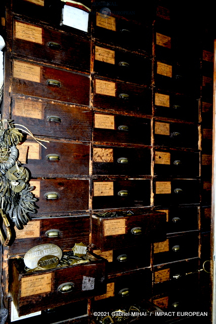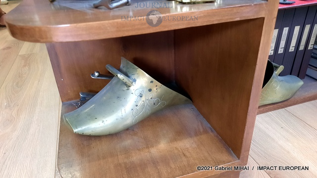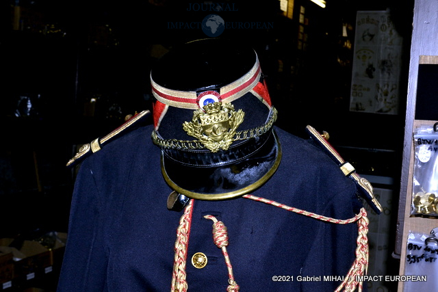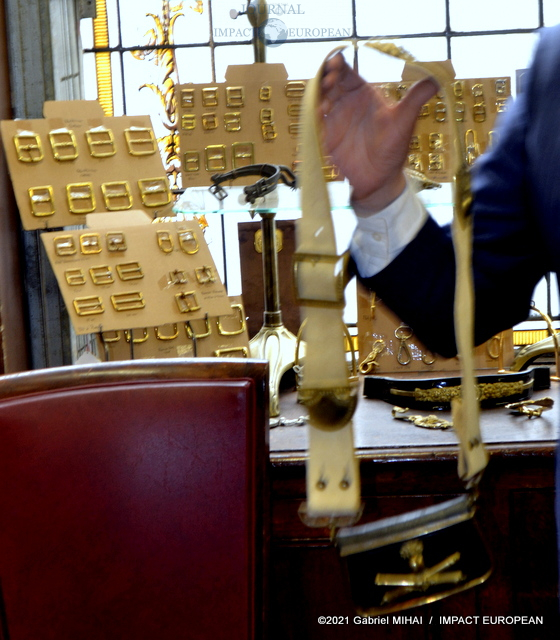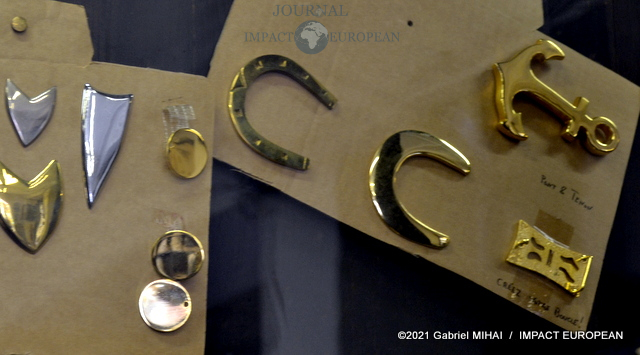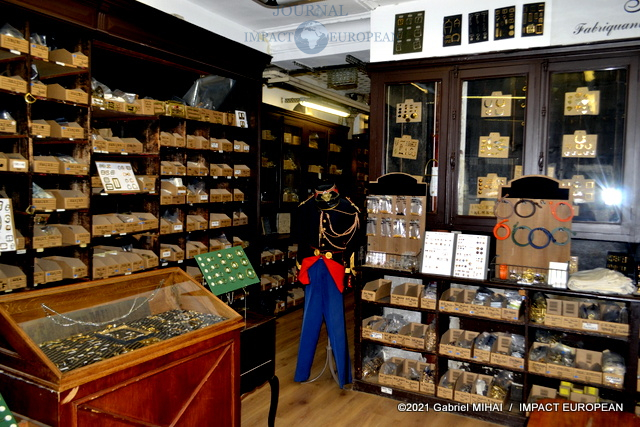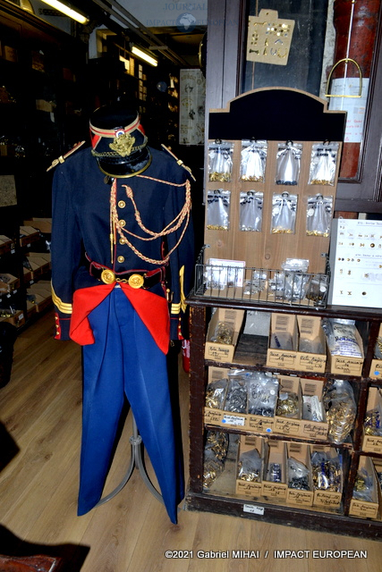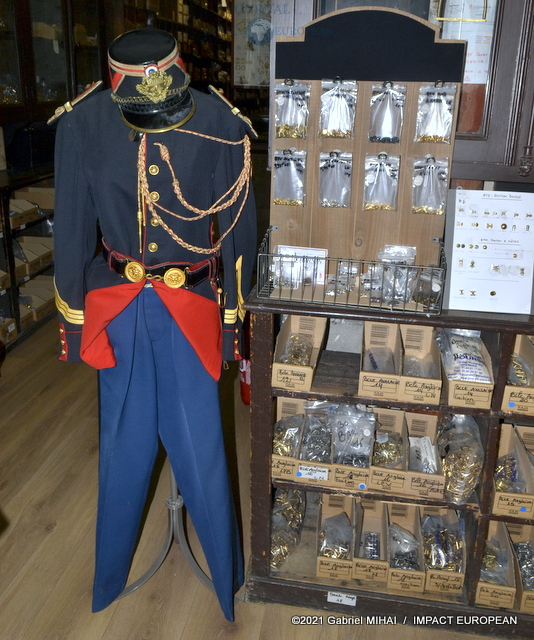 Une tenue de garde républicain siège à l’entrée du couloir qui mène à l’atelier. Tout le long, des casiers et des tiroirs de chêne remplis d’accessoires et de pièces d’ornementation.