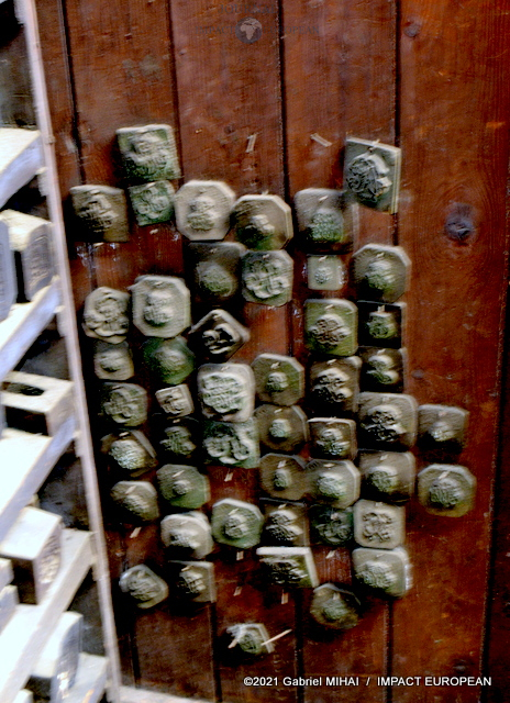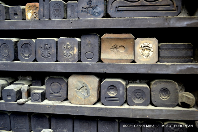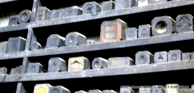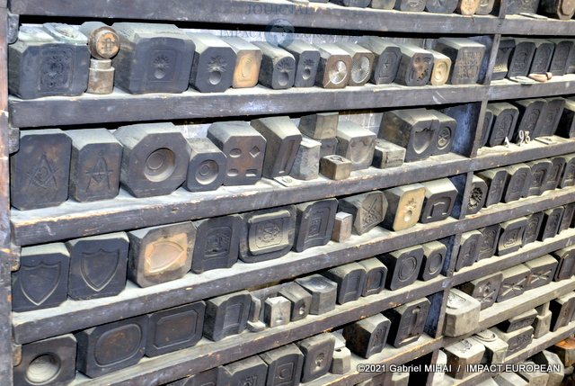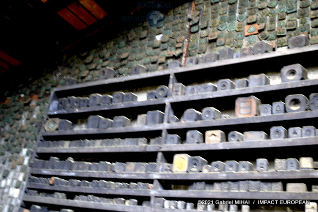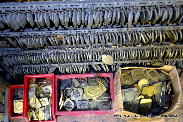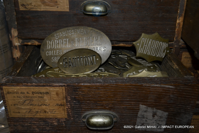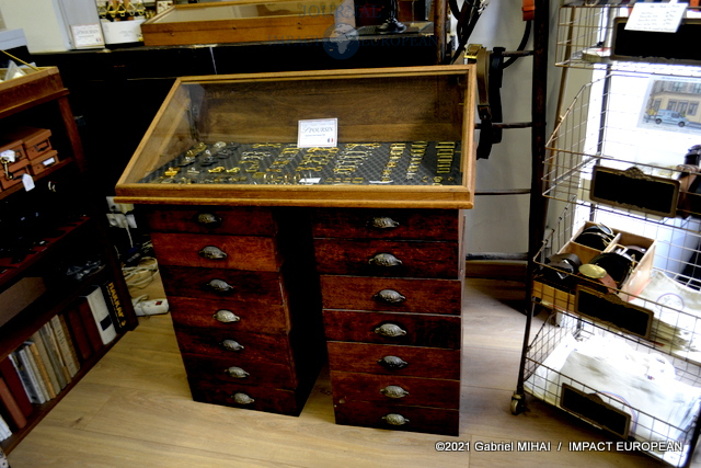 A l’étage, une collection de matrices, des emporte-pièces, des moules en fonte, des plaques d’initiales, de vieilles affiches et des documents d’archive ainsi que des registres sur lesquels figurent les signatures des plus grands couturiers français.