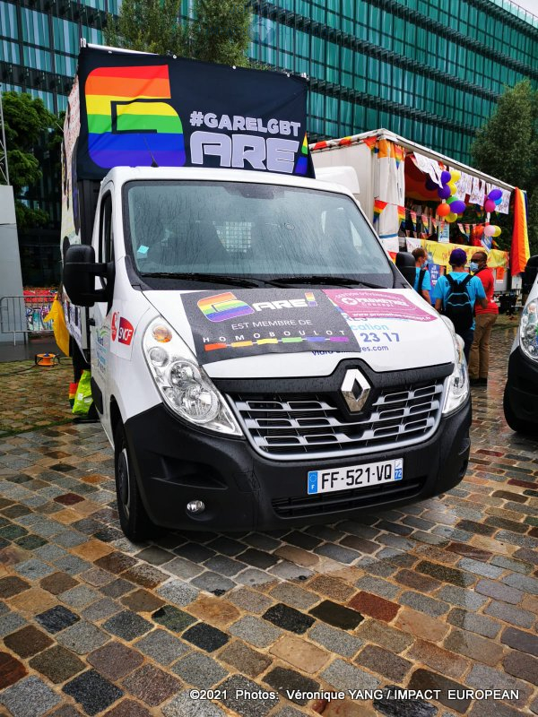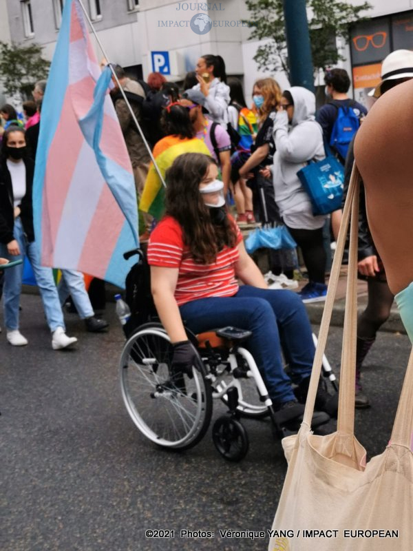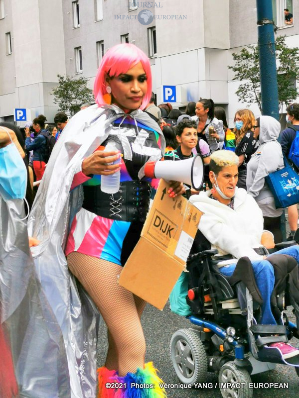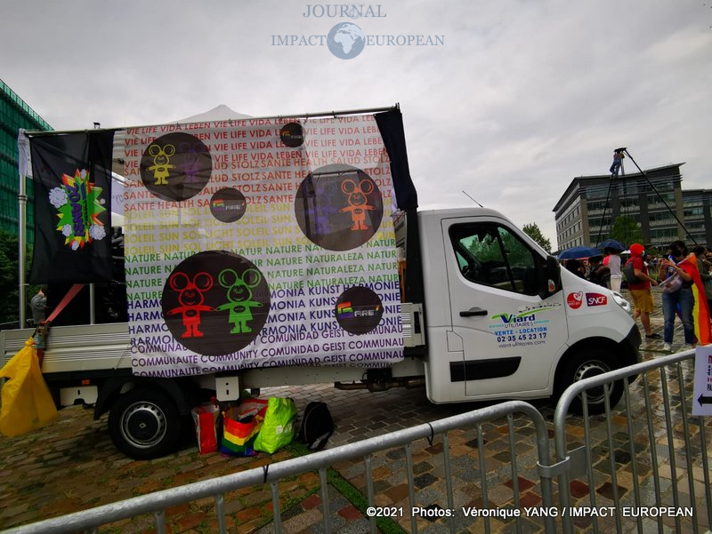 L’Interlgbt a mis 2 véhicules (2×25 participants) à la disposition des Personne à Mobilité Réduite ou en Situation de Handicap. Le premier se situait à l’avant du cortège, le second plus au calme..