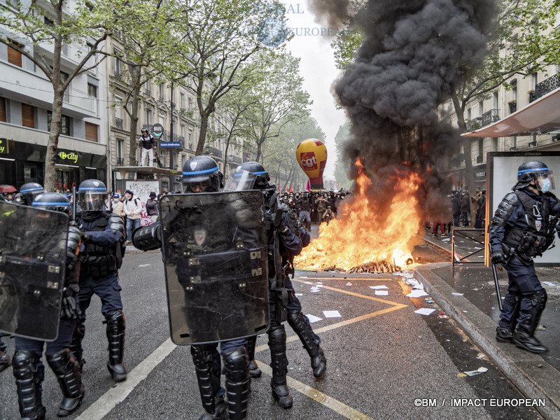 Des heurts ont éclaté à Paris, en marge de la manifestation du 1er mai. Après une demie- heure, on a observé des tensions dans le cortège, forçant la BRAV à intervenir contre les actions de Black Blocks.. Au total, la Préfecture avait mobilisé 5 000 policiers et gendarmes . Tirs de feux d’artifice, lancé de projectiles, gaz lacrymogène, interpellations, charge des forces de l’ordre… retardent l’arrivée du cortège à la Nation. Le nombre d’arrestations , de 17 au début, a atteint 46 à la fin de la manifestation dont 14 garde-à-vue. On déplore 21 blessés dont 4 graves.