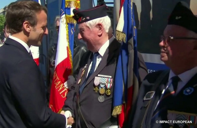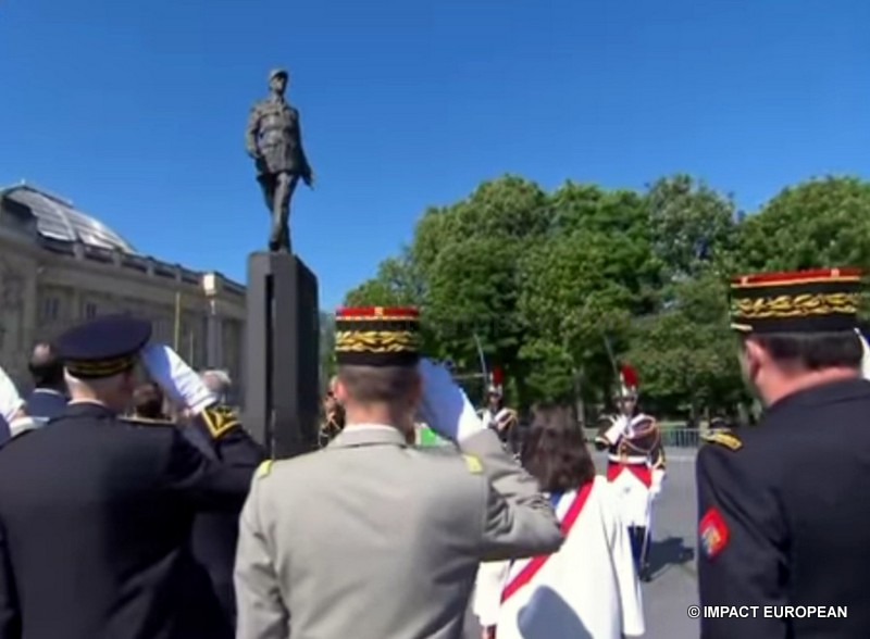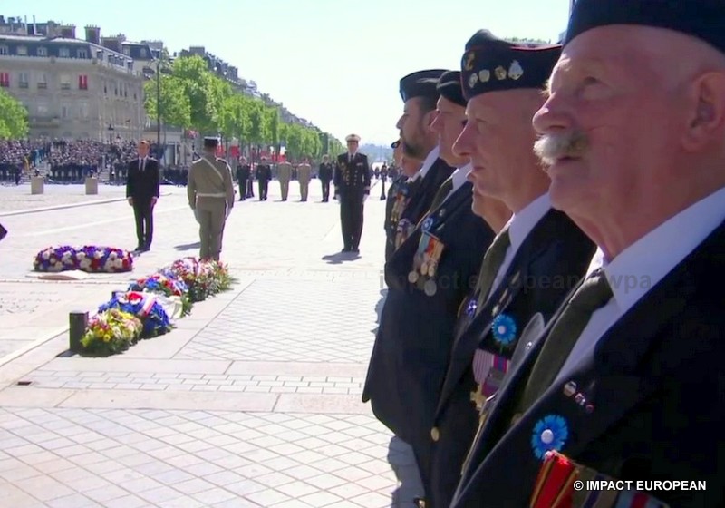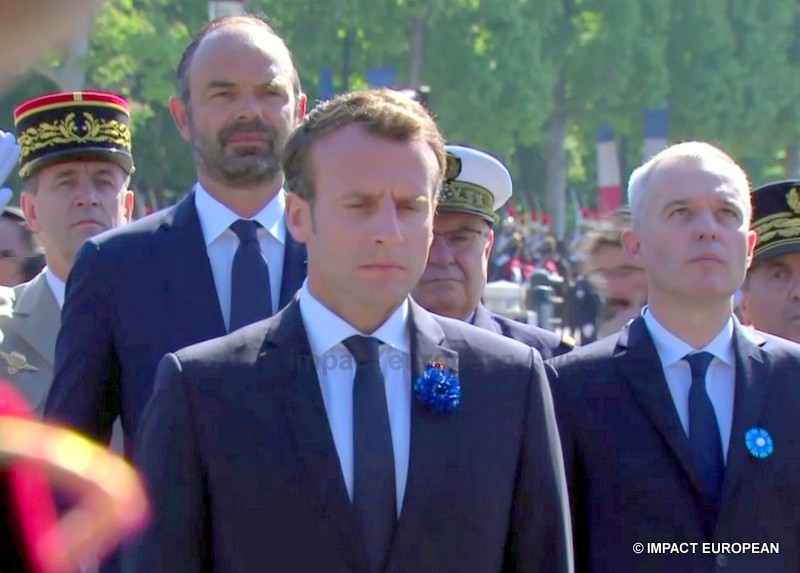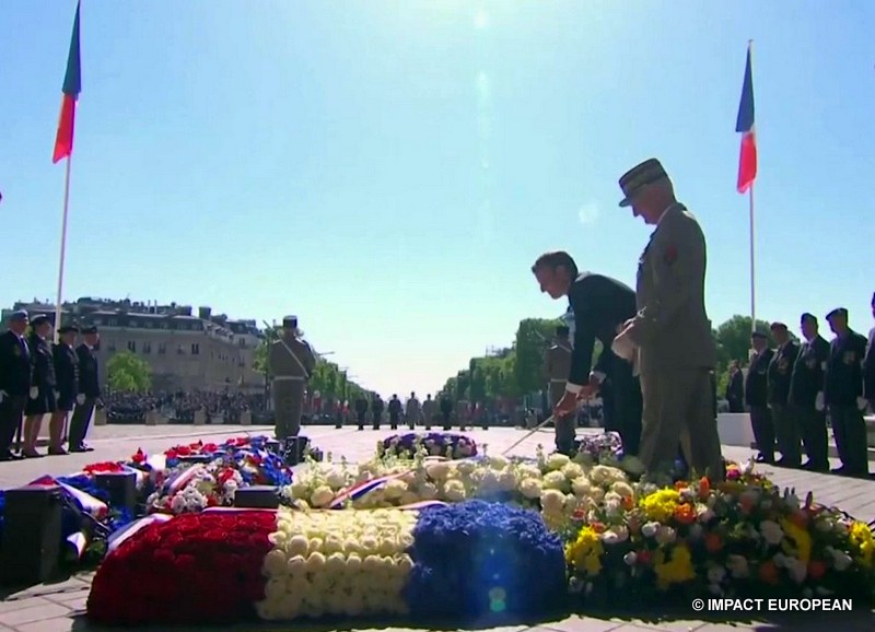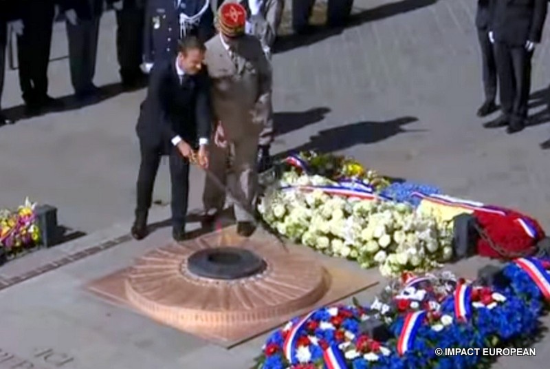 Ce matin, pour sa première commémoration en tant que président de la République en place, Emmanuel Macron qui portait un oeillet bleu à la boutonnière en souvenir des morts tombés pour la France, s’est recueilli place Clémenceau, devant la statue du Général de Gaulle signée Jean Cardot, inaugurée par Jacques Chirac en 2000; elle représente le Général de Gaulle au moment de la Libération de Paris lors de la descente des Champs-Elysées le 26 août 1944. Il a ensuite remonté les Champs Elysées, accompagné du Premier ministre Edouard Philippe, de la ministre des Armées, Florence Parly, de la secrétaire d’état aux Anciens Combattants, Geneviève Darrieussecq, de la maire de Paris Anne Hidalgo et des présidents de l’Assemblée Nationale et du Sénat, Jean-François de Rugy et Gérard Larcher. Après l’hymne national et avoir passé les troupes en revue, il a déposé une gerbe puis ravivé la flamme du Soldat Inconnu, il a ensuite salué les anciens combattants et les responsables de l’état major. Aucun discours n’a été prononcé, la »Marseillaise » et le « Chant des Partisans » par les choeurs de l’Armée Française ont retenti avant la signature du livre d’or. L’an dernier, Emmanuel Macron était accompagné de François Hollande, grand absent cette année contrairement à Nicolas Sarkosy.