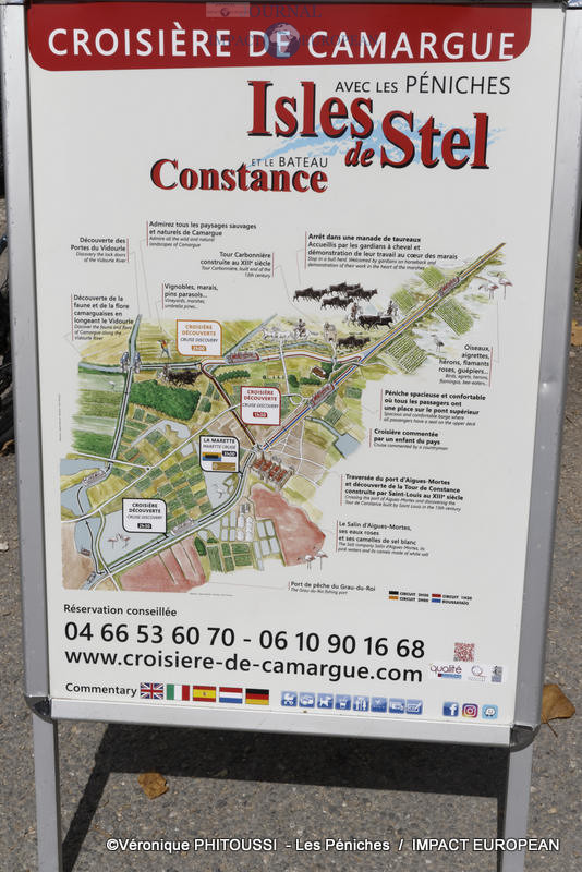 Le Constance est un bateau de navigation fluviale pouvant accueillir 120 personnes, en configuration croisière et 70 personnes, pour les séminaires ou repas d’affaires. Ce type de bateau mesure 25,70 m par 5, 50 m ; Les péniches Isles de Stel ou le bateau Constance permettent la visite d’Aigues-Mortes sous un angle différent, celui des canaux avec sa faune, sa flore et les flamants roses.