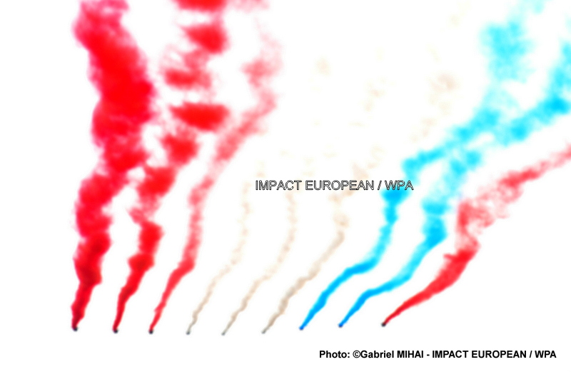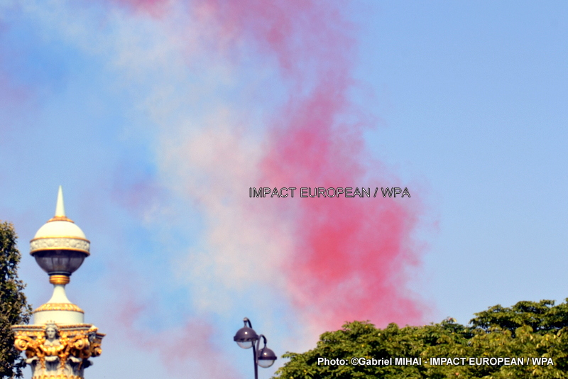 Au moment où la Patrouille de France survolait la capitale, l’un des neuf Alphajet mobilisés a lâché un fumigène rouge au lieu d’un bleu. Ce qui a quelque peu perturbé l’allure de la spectaculaire traînée bleu-blanc-rouge aux couleurs du drapeau français dans le ciel parisien, image emblématique du défilé, ce n’aurait pas été une erreur mais un hommage aux blessés dans les rangs de l’armée et aux victimes des ouragans Irma et Maria selon les réseaux sociaux, contrairement à ce qu’a déclaré la Patrouille de France..