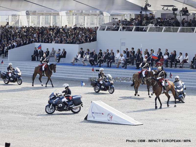 Peu de temps après le début de la cérémonie sur les Champs-Élysées, deux motards de la gendarmerie se sont percutés à faible vitesse et ont chuté devant la tribune officielle.