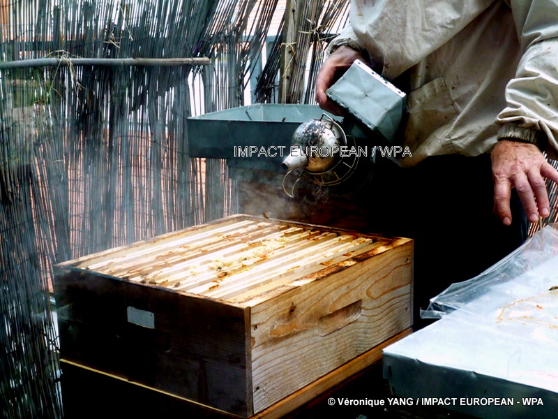 Les différentes étapes de la récolte commencent par l’enfumage des abeilles, le décollage et brossage des cadres et le transport dans un véhicule étanche jusqu’à la miellerie. Il faut ensuite désopercuter à l’aide d’un couteau spécial en tranchant la couche de cire de bas en haut c’est à dire enlever la pellicule de cire qui bouche les alvéoles remplies de miel. Arrive alors l’extraction du miel par une machine munie d’une manivelle qui fait tourner les cadres posés sur un bras et fait jaillir le miel sur les parois. A la sortie de l’extracteur, le miel contient des impuretés, on procède au filtrage à l’aide d’ une grille à double filtre qui va retirer diverses particules de propolis, de cire, d’opercules, de pattes d’abeilles ou de pollen.Une fois filtré, le miel doit encore reposer 4 à 5 jours à une température de 20°C minimum pour faire remonter en écume l’ensemble des dernières impuretés. Cette écume est ensuite enlevée avant le conditionnement.