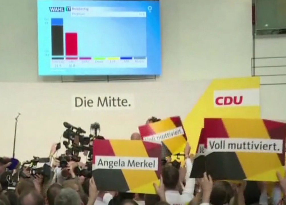 D’après les projections de la chaîne ARD, le bloc CDU-CSU de la chancelière est donné vainqueur du scrutin avec 32,8% des voix. C’est moins que le précédent plus bas historique déjà atteint par Mme Merkel en 2009 (33,8%) et très en deça des 41,5% obtenus il y a quatre ans.