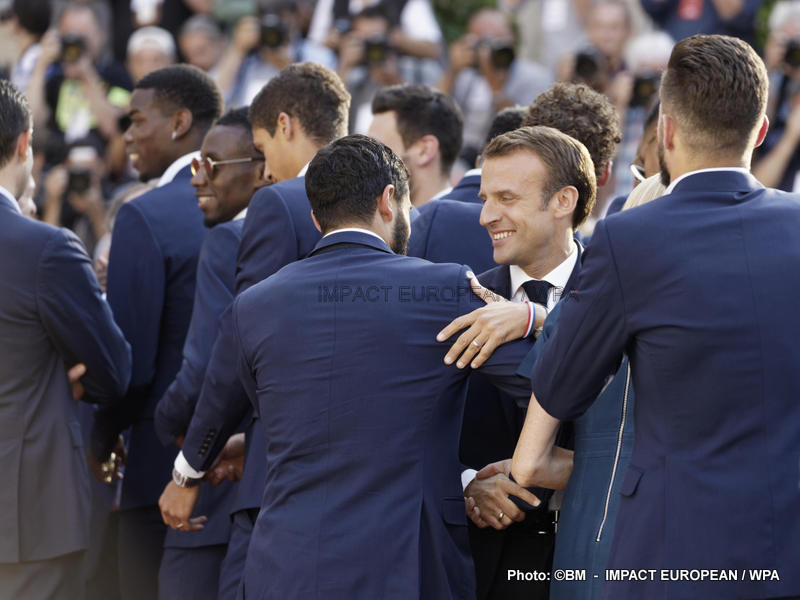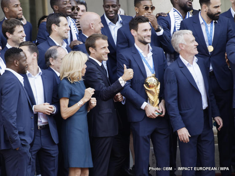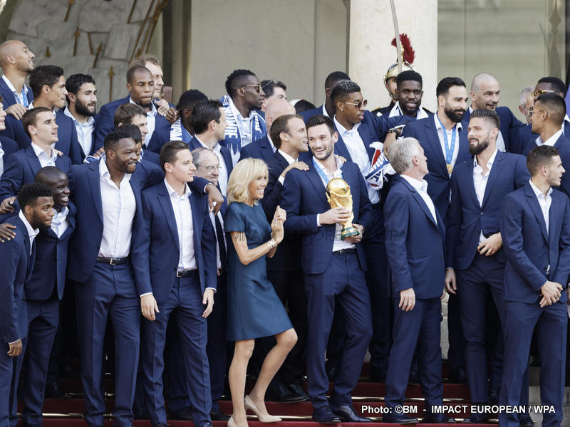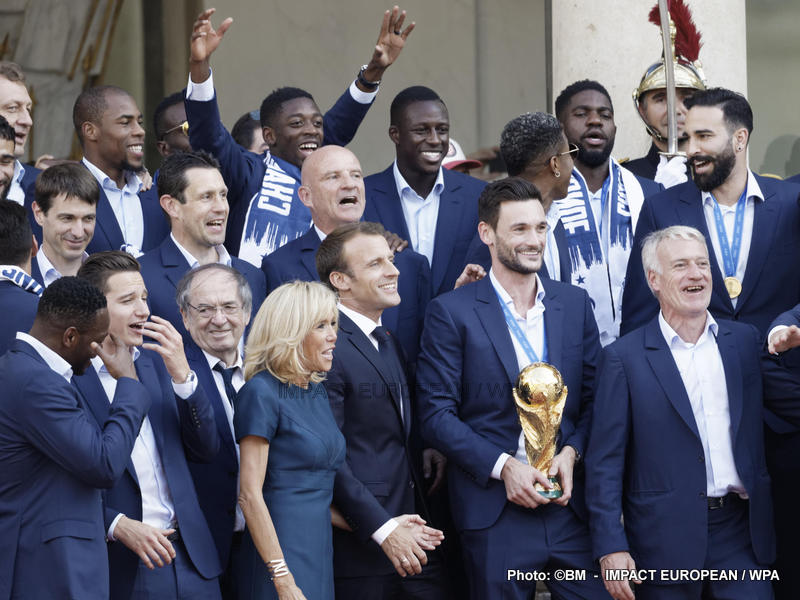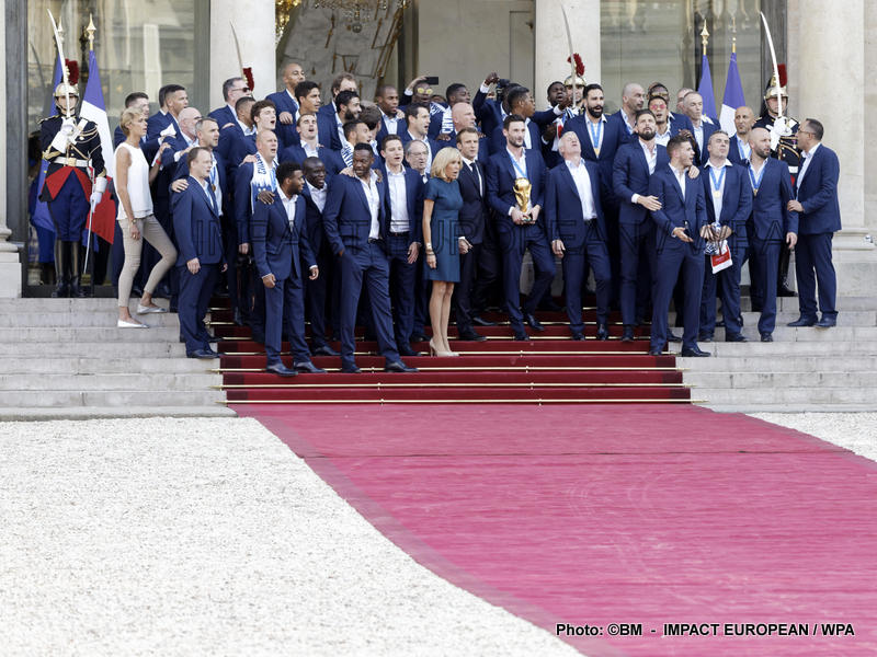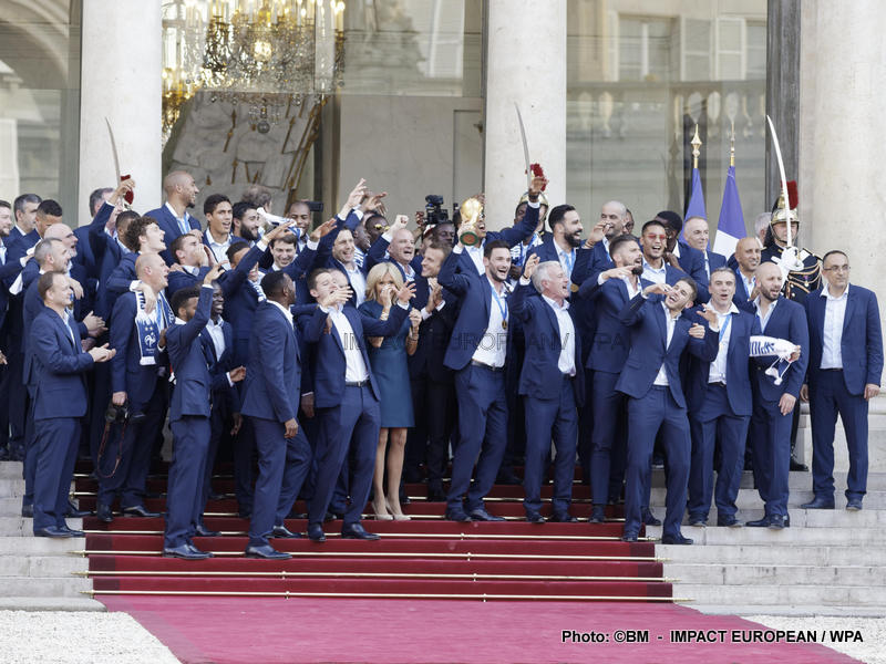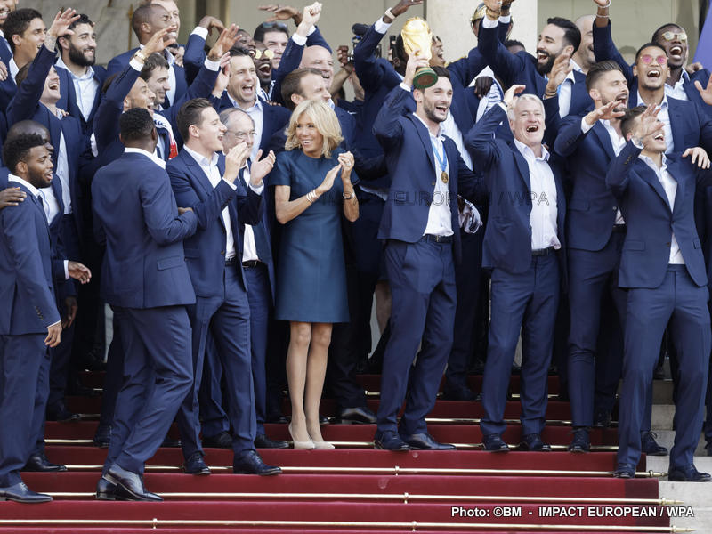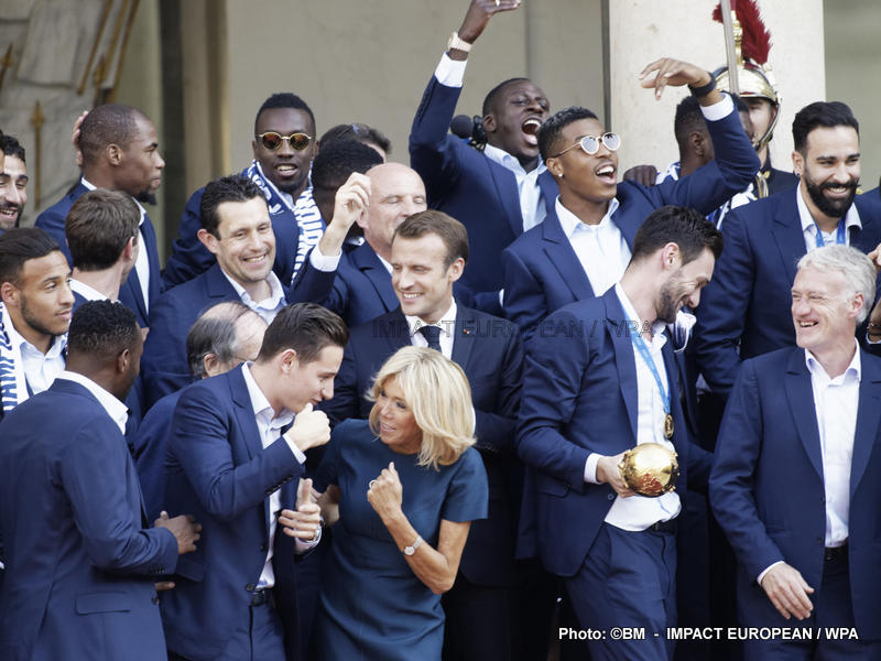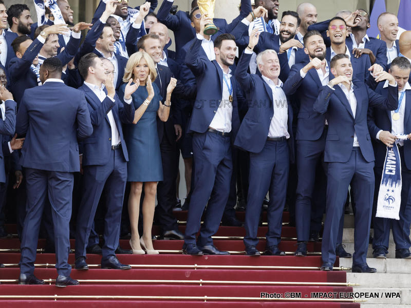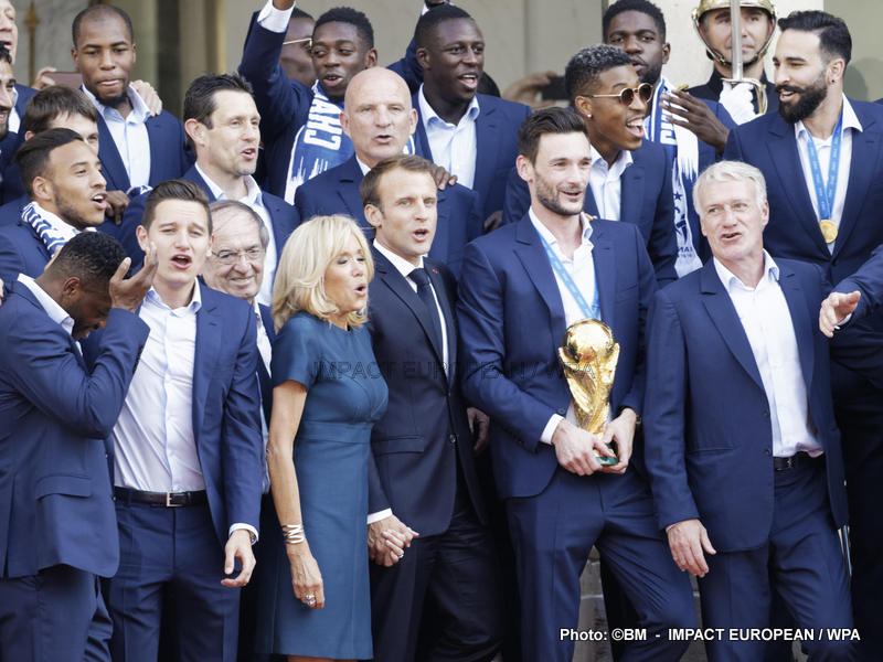 Emmanuel Macron et son épouse Brigitte ont ensuite accueilli en début de soirée les joueurs de l’équipe de France pour célébrer leur titre mondial. Dans une ambiance extrêmement décontractée, les Bleus et leur entraîneur Didier Deschamps ont posé avec le couple Macron sur le perron de l’Élysée face aux caméras, avant de chanter à tue-tête et a capella l’air de « I will survive », puis une Marseillaise.