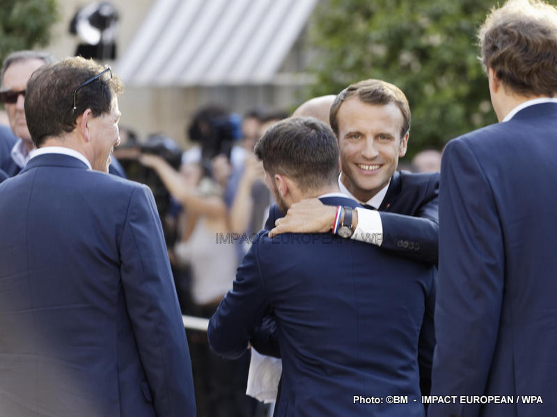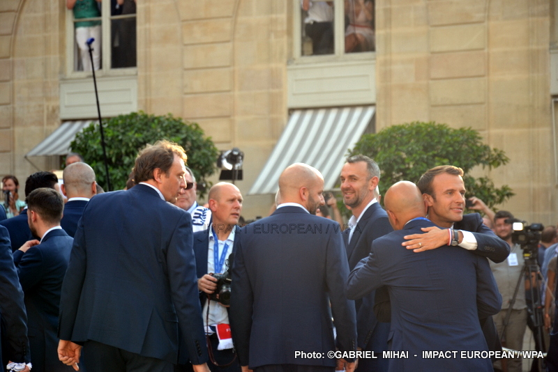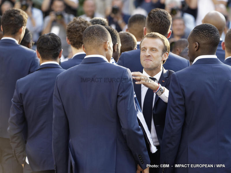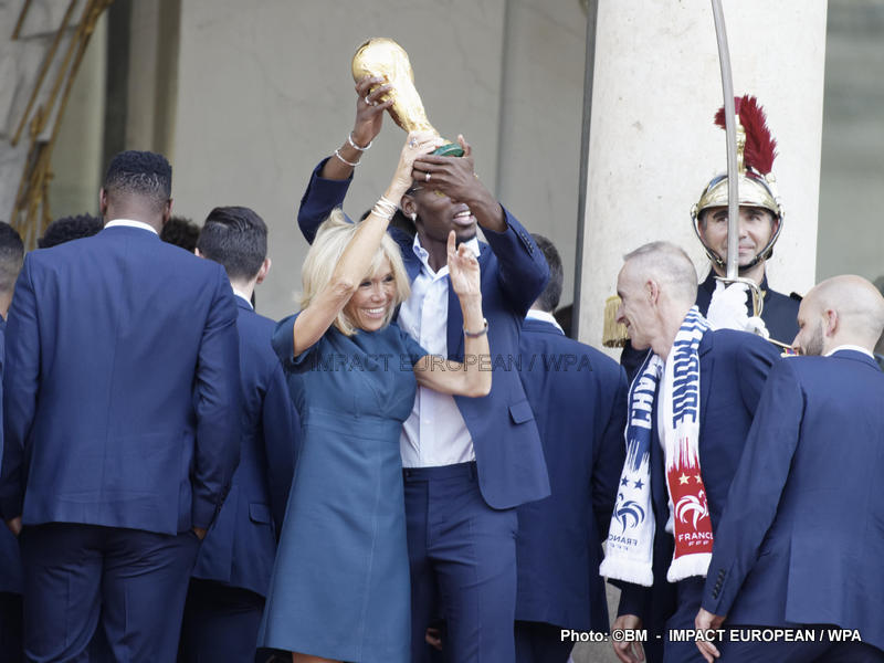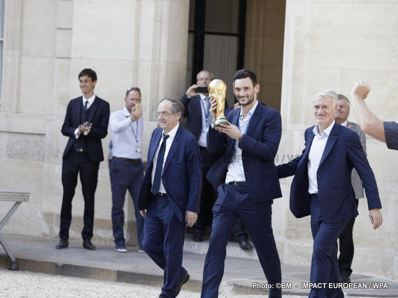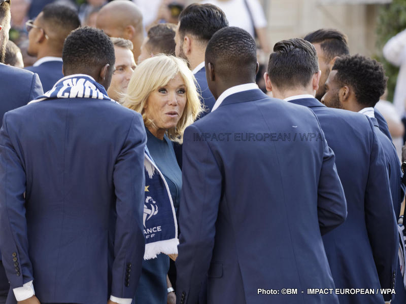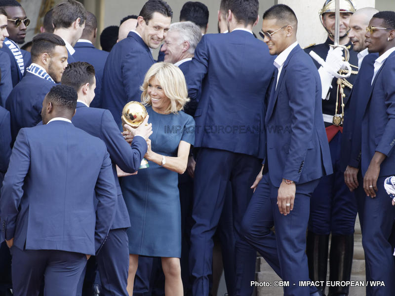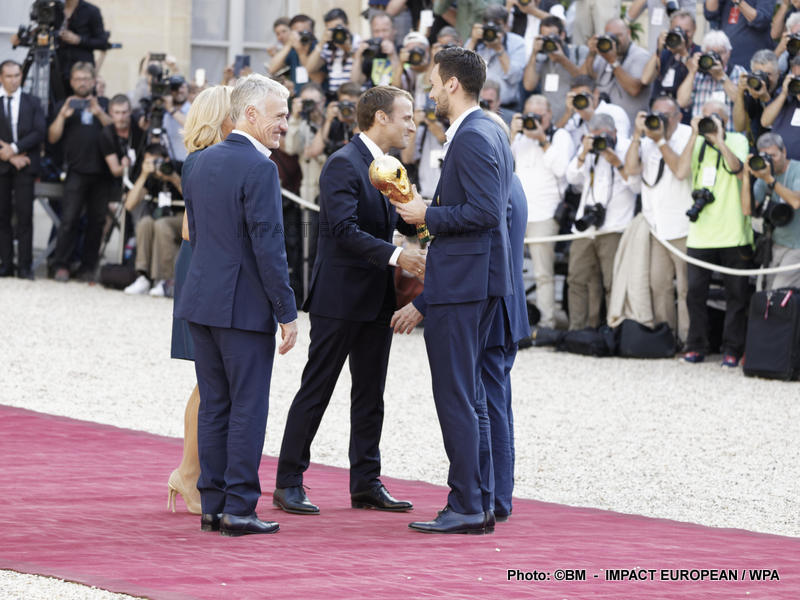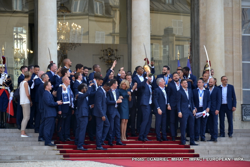 Emmanuel Macron et son épouse Brigitte ont ensuite accueilli en début de soirée les joueurs de l’équipe de France pour célébrer leur titre mondial. Dans une ambiance extrêmement décontractée, les Bleus et leur entraîneur Didier Deschamps ont posé avec le couple Macron sur le perron de l’Élysée face aux caméras, avant de chanter à tue-tête et a capella l’air de « I will survive », puis une Marseillaise.