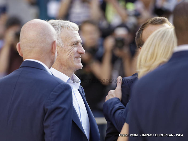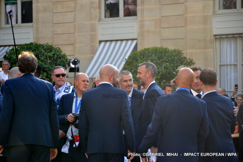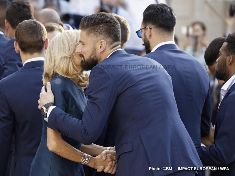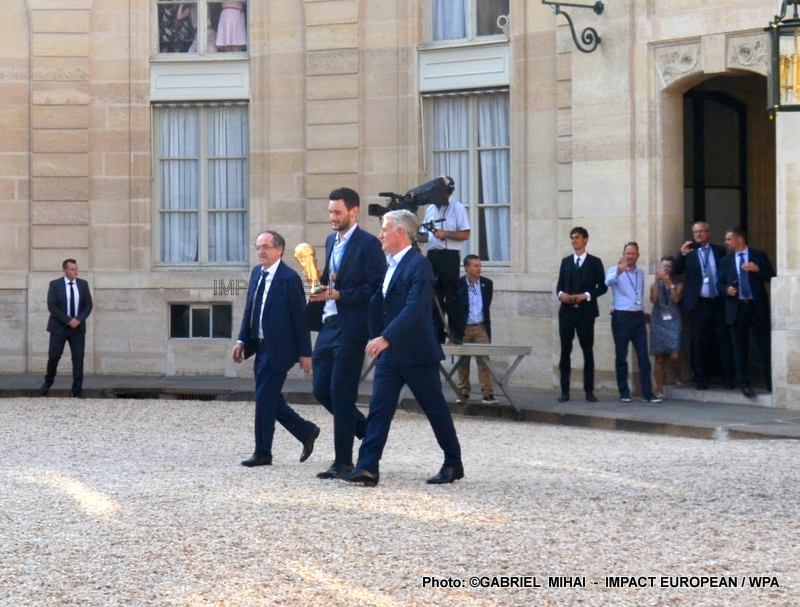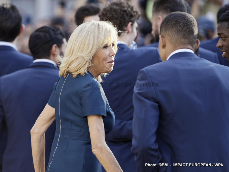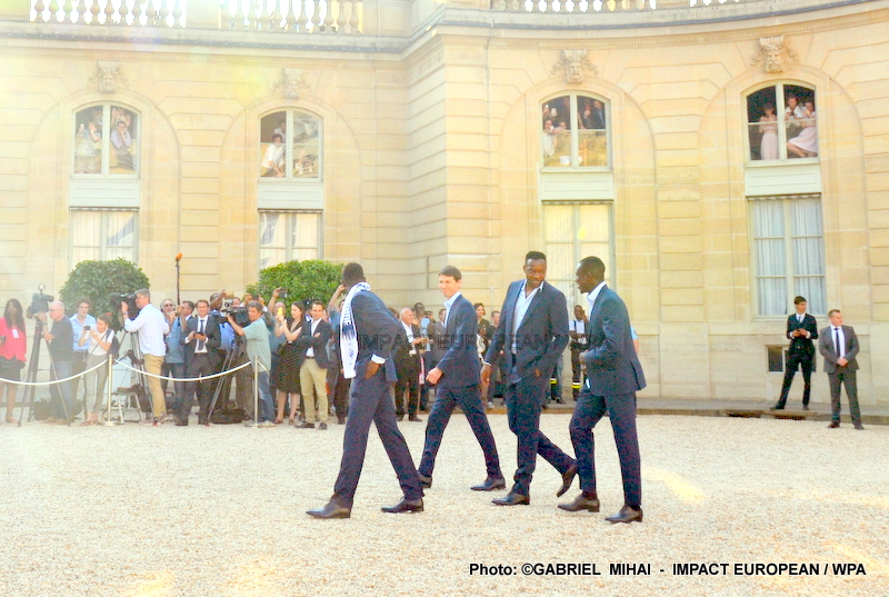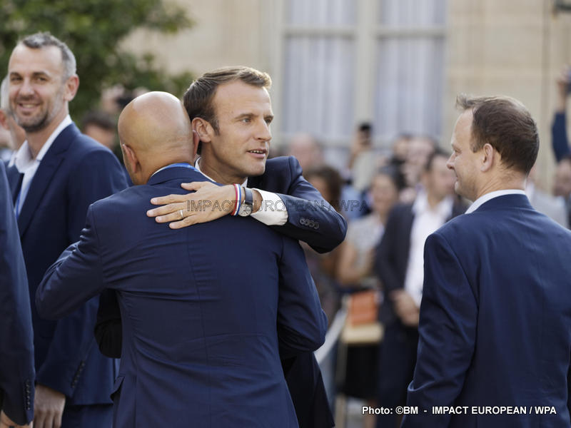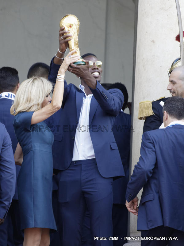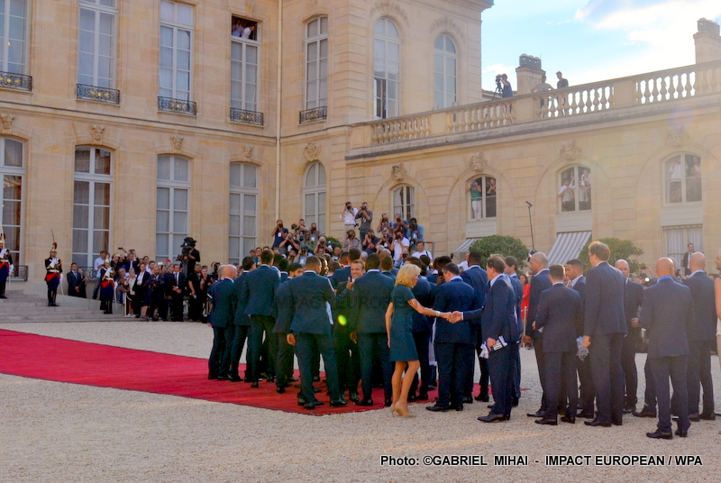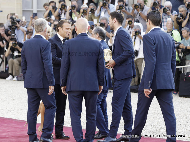 Emmanuel Macron et son épouse Brigitte ont ensuite accueilli en début de soirée les joueurs de l’équipe de France pour célébrer leur titre mondial. Dans une ambiance extrêmement décontractée, les Bleus et leur entraîneur Didier Deschamps ont posé avec le couple Macron sur le perron de l’Élysée face aux caméras, avant de chanter à tue-tête et a capella l’air de « I will survive », puis une Marseillaise.