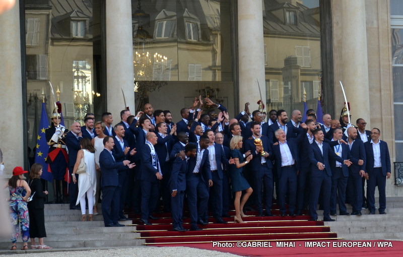 Emmanuel Macron et son épouse Brigitte ont ensuite accueilli en début de soirée les joueurs de l’équipe de France pour célébrer leur titre mondial. Dans une ambiance extrêmement décontractée, les Bleus et leur entraîneur Didier Deschamps ont posé avec le couple Macron sur le perron de l’Élysée face aux caméras, avant de chanter à tue-tête et a capella l’air de « I will survive », puis une Marseillaise.