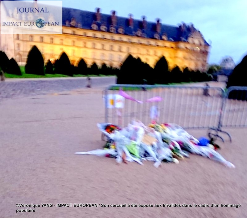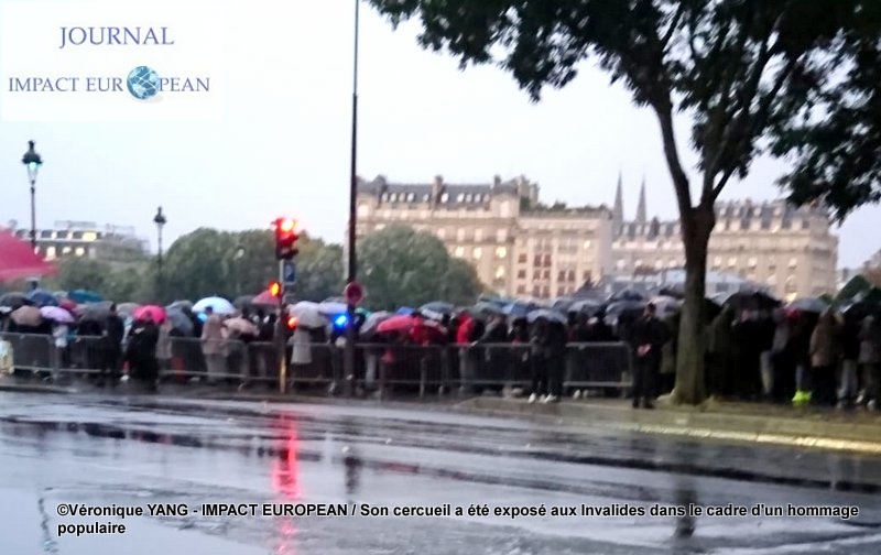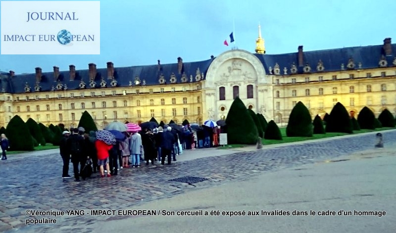 À l’extérieur de l’hôtel des Invalides, dans le calme et le recueillement environ 7000-8000 personnes dans la file d’attente, impressionnante, s’étendait en milieu d’après-midi sur plus de 600 – 700 mètres. Dans la foule, une pancarte «Adieu président, vous nous manquez déjà», des fleurs… Certains ont patienté depuis le matin, malgré les averses.
