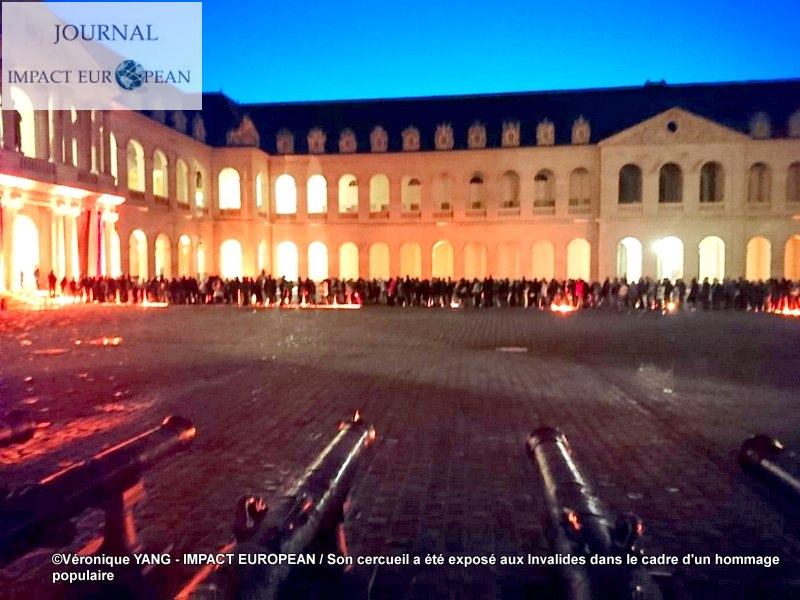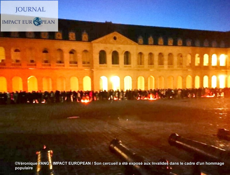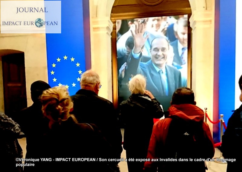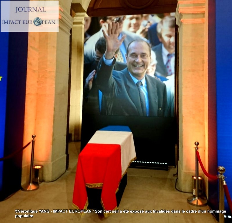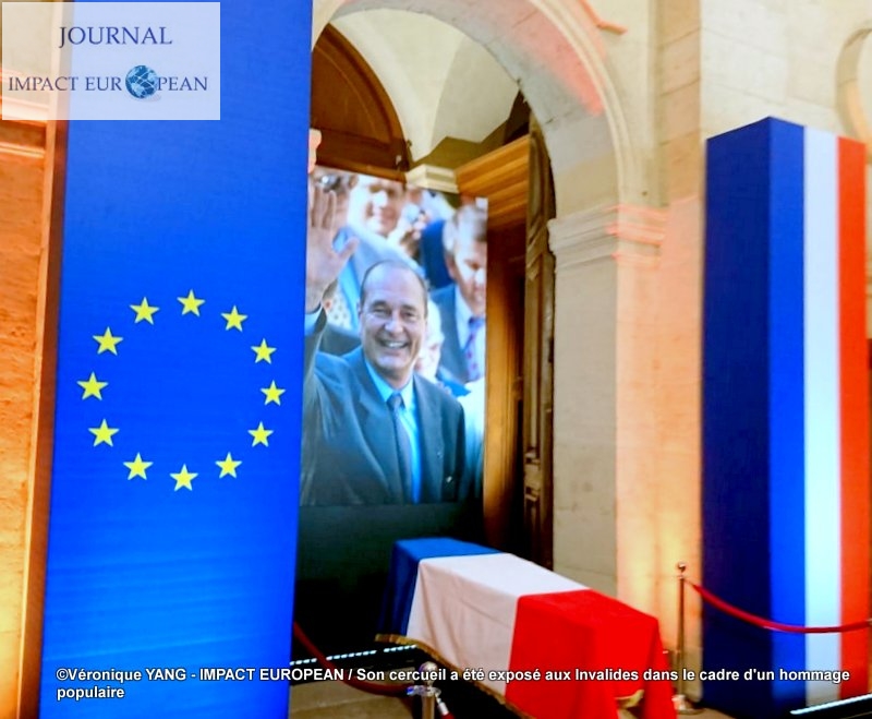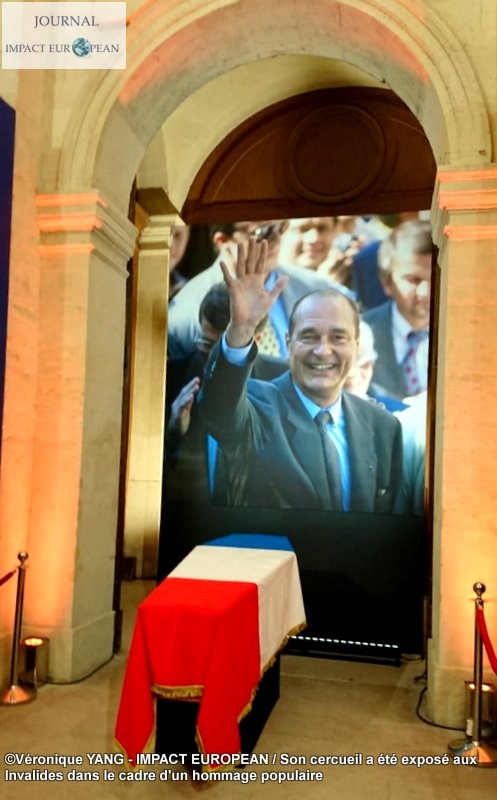 La foule a ensuite pu commencer à défiler devant le cercueil, exposé à l’entrée de la cathédrale Saint-Louis des Invalides. Recouvert du drapeau bleu-blanc-rouge, il avait été placé sous un portrait géant de l’ancien président et entre deux colonnes aux couleurs l’une du drapeau français, l’autre du drapeau européen.