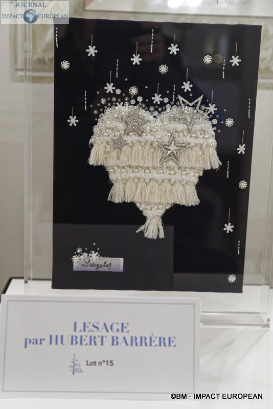 Lesage était représenté par Hubert Barrère et une réalisation, « Un coeur en hiver« , sur un satin couleur nuit, coeur brodé en tweed et laine beige et blanche, glacé de perles de cristaux et paillettes argent, cristal et givre.