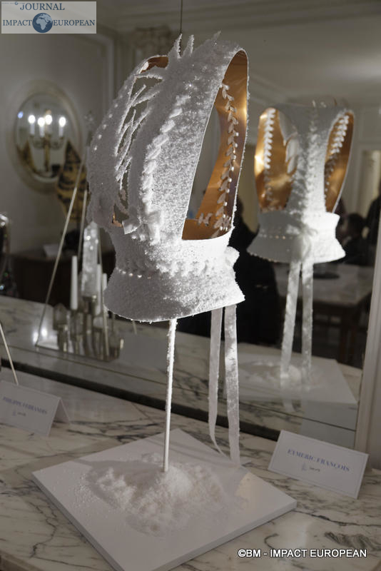 Eymeric François qui fêtera en juillet prochain ses 20 ans de collections lors de la semaine de la Haute Couture à Paris, présentait « Fluffy Cruel Corset« , un corset de plexiglass cuivre lacé de rubans de velours, floqué neige et pailleté argent. Une rétrospective de ses créations, pièces uniques en épingles, était visible du 27 juillet au 2 novembre à la manufacture Bohin, à l’Aigle en Normandie.