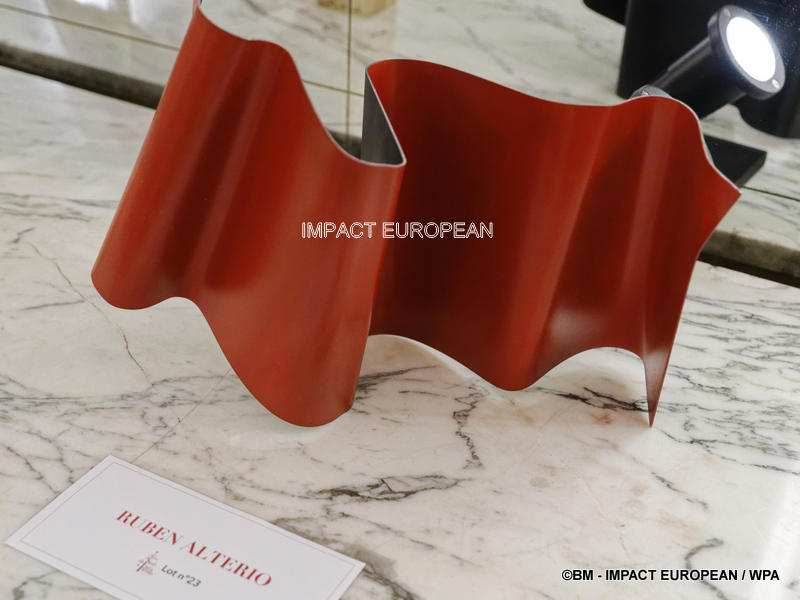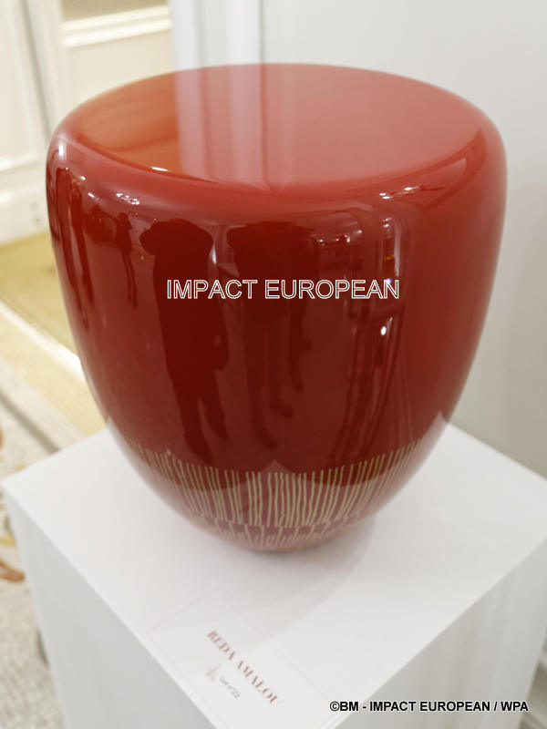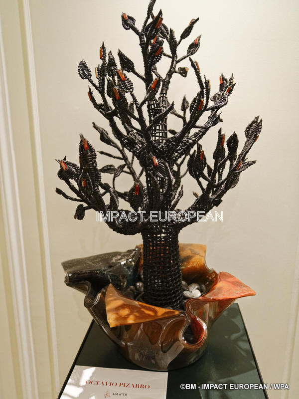 La pièce réalisée par Octavio Pizarro pour la vente aux enchères est composée de rotin peint en noir , d’un vase modelé en verre et des pierres de Swarovski.