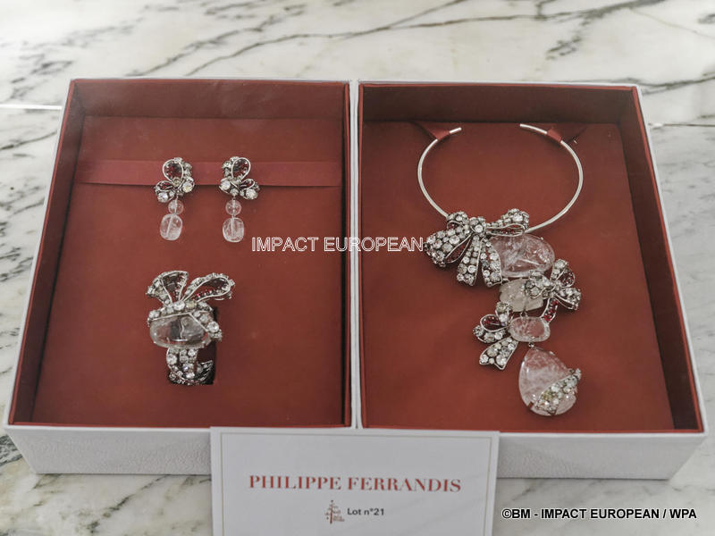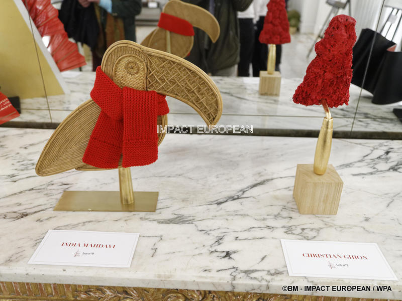 CHANEL (sculpture lumineuse en résine: Paris, la Nuit Rouge)-CHANTAL THOMASS avec Barrisol (paravent lumineux)- CHRISTIAN DIOR (petit théâtre en papier illuminé) – CHRISTIAN GHION (sculpture en bois et acier: l’Art d’Être Maçon)- ELIE SAAB (miniature- robe sous cloche: Rêve Haute Couture)-EMANUEL UNGARO (boîtes de velours ornées de rubans: Sapin de cadeaux) – EMMANUELLE RYBOJAD (pyramide lumineuse: CristalCastle)- FRANCIS KURKDJIAN (flacon d’eau de parfum: Un soir à Paris)- INDIA MAHDAVI (rotin et laine: Toucan) -JEAN-CLAUDE JITROIS (robe longue en daim: Atout Coeur)- JEAN-CHARLES DE CASTELBAJAC (dessin de papier: Arbre Réversible)- JEAN PAUL GAULTIER avec Blachère Illumination (structure lumineuse: La Dame de Fer-érique )- JEAN-JACQUES ORY (structure en bois et bambou: L’Amour à la Vie)- LESAGE PAR HUBERT BARRERE (broderies de paillettes: Le Coeur d’Hubert)-MARC-ANTOINE COULON, créateur pour la seconde année de l’affiche,et illustration: Roi des Forêts) – MATHILDE DE L’ECOTAIS (tirage photo:De la Vigne au Verre)- OCTAVIO PIZARRO (arbre tricoté en rotin, vase modelé en verre, cristaux Swarovski: Arbre de vie) – OLIVIA PUTMAN (sculpture lumineuse: Parlez-moi d’amour) – OLIVIER THEYSKENS (3 aquarelles: Treeptych)- PATRICK HOURCADE ( sculpture lumineuse en laiton: Planetarium)- PHILIPPE FERRANDIS (collier cascade, manchette, boucles d’oreilles: Montaigne)- REDA AMALOU (pièce de design : Christmas Dot)- RICHARD RENÉ pour GUY LAROCHE ( -RUBEN ALTERIO (sculpture en acier: Rouge Couture-Paris la Nuit) – SASCHA NORDMEYER ( papier aquarelle Canson: Espace-Temps 50) – SYLVAIN LE GUEN (12 éventails: Rouge Revue) – VHERNIER MILANO (envolée de ballons:Palloncini)- YULIA YANINA (sapin tradition russe: Mon Sapin Couture)