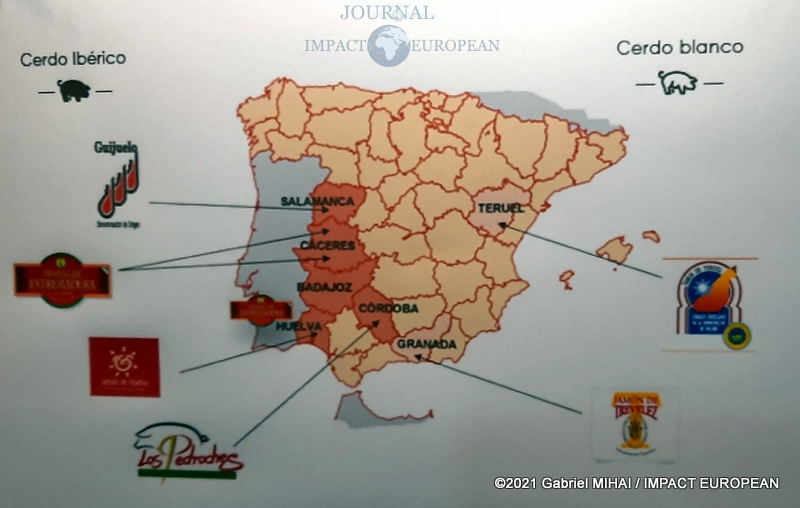 Les zones de production principales de jambons et épaules sont principalement situées au sud et sud-ouest d’Espagne. Les zones doivent accomplir des requis très spécifiques comme le type de pâturage où sont élevés les porcs, le climat, etc. Les caractéristiques climatologiques, géographiques et orographiques des zones de production sont très importantes pour la production et le séchage des jambons, puisque ces facteurs sont déterminants pour obtenir sa qualité caractéristique.