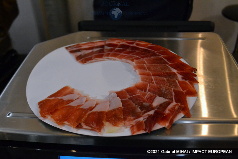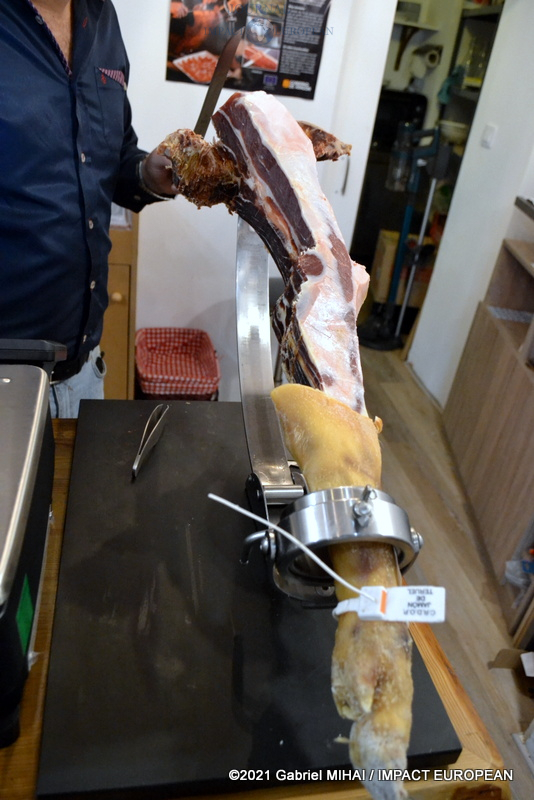 Il faut couper le jambon en tranches fines (presque transparentes), sur toute la largeur de la pièce, pas trop longues 6 ou 7 cm au fur et à mesure que l’on coupe, on doit enlever la couenne et le gras de couverture sur les bords et les coupes seront toujours parallèles entre elles et se font du sabot vers la pointe, en laissant toujours une surface plane et sans stries.